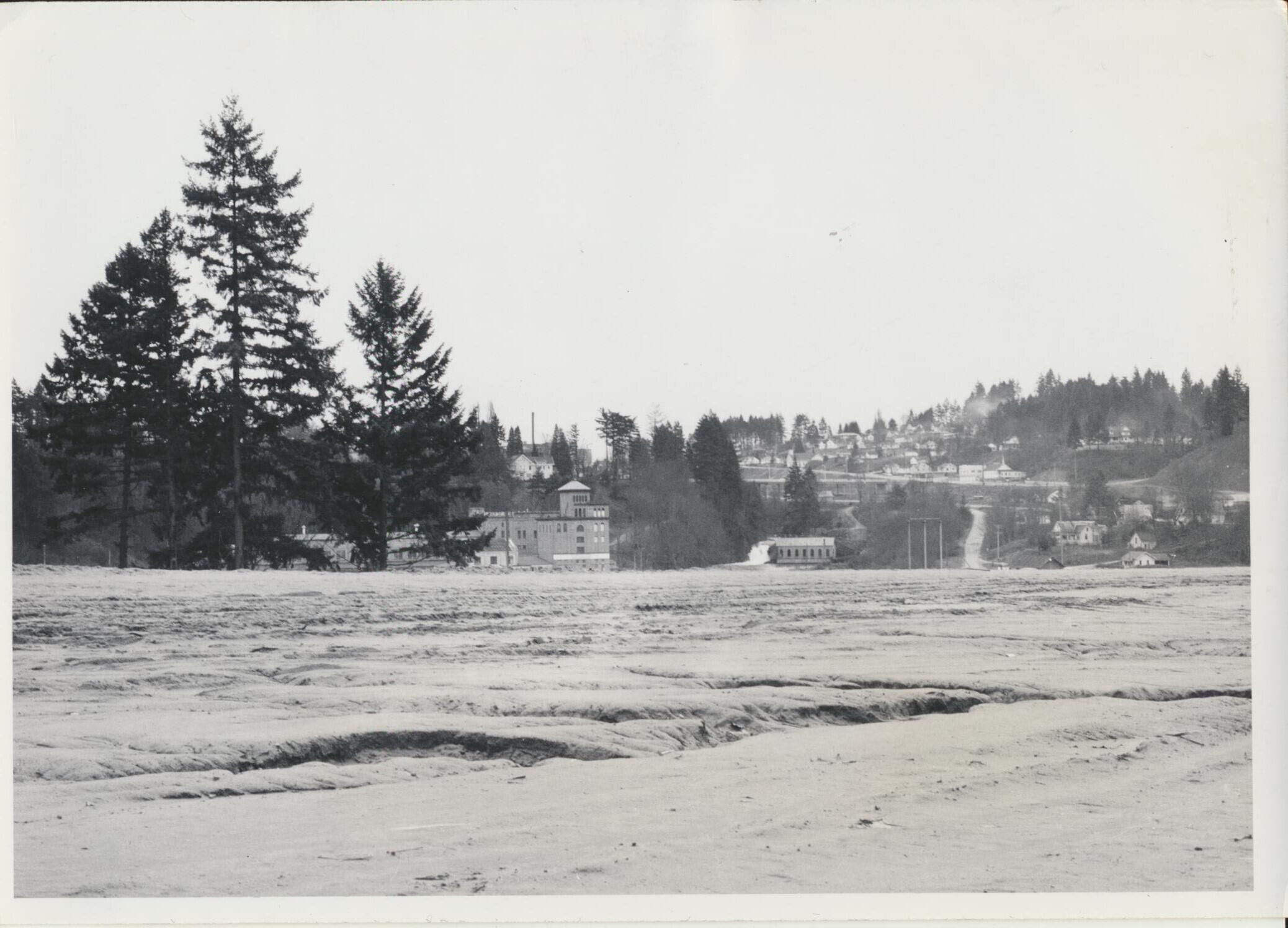 Photograph. Old Olympia brewery in background, then Schmidt House, then later brewery. Tumwater Hill to right. Photographer standing on graded base for I-5, looking south. "South lane Seattle-Portland near Sherm's place." (refers to Sherm Huffine)Name/Title