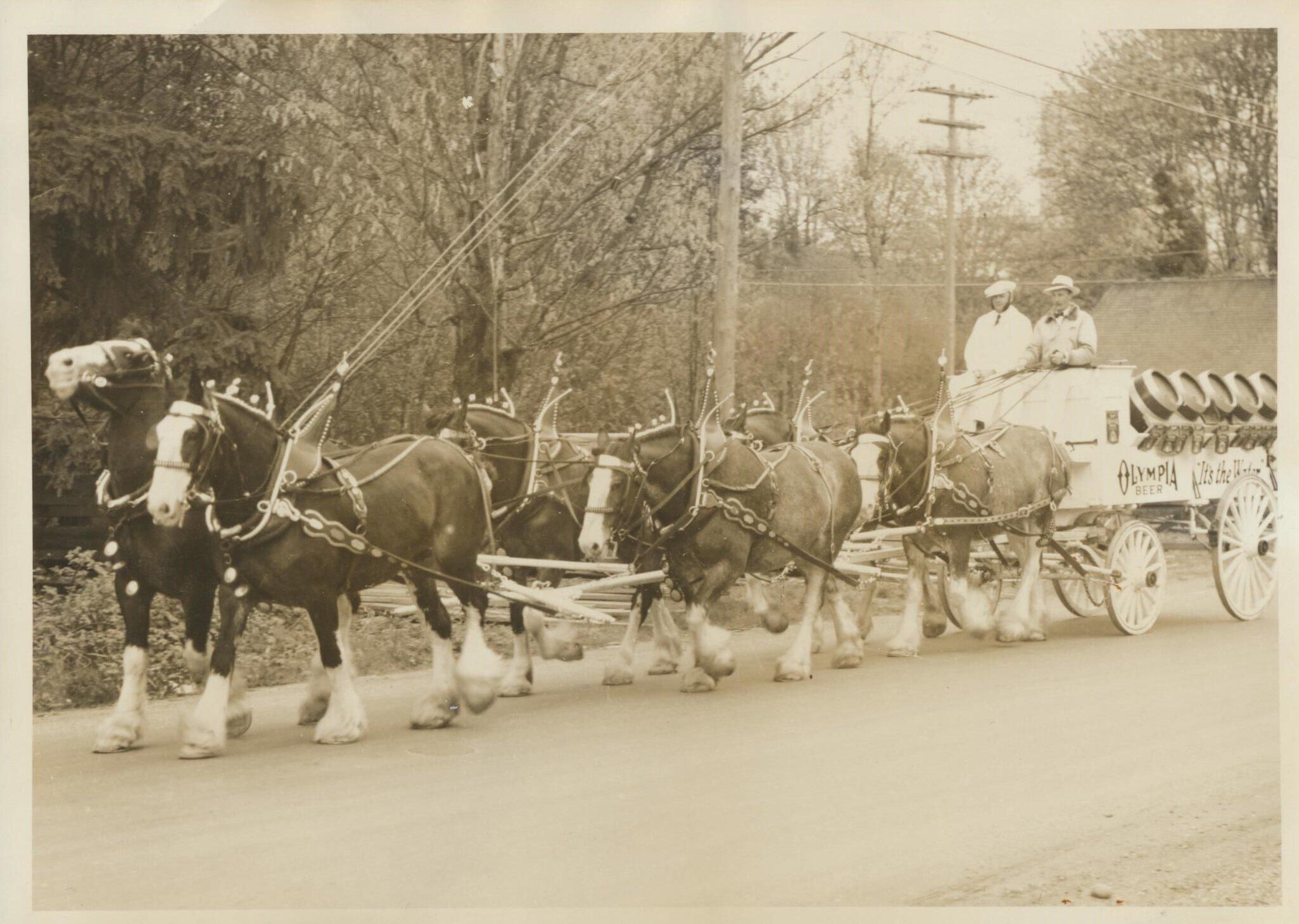 Photograph. In May 1950, the City of Olympia celebrated its centennial. The Olympia Brewing Company joined the festivities with a beer wagon pulled by six Clydesdale horses from a farm in Lynden, Washington. The wagon and team are shown here in Tumwater, with the Capital Boulevard bridge in the background.Name/Title