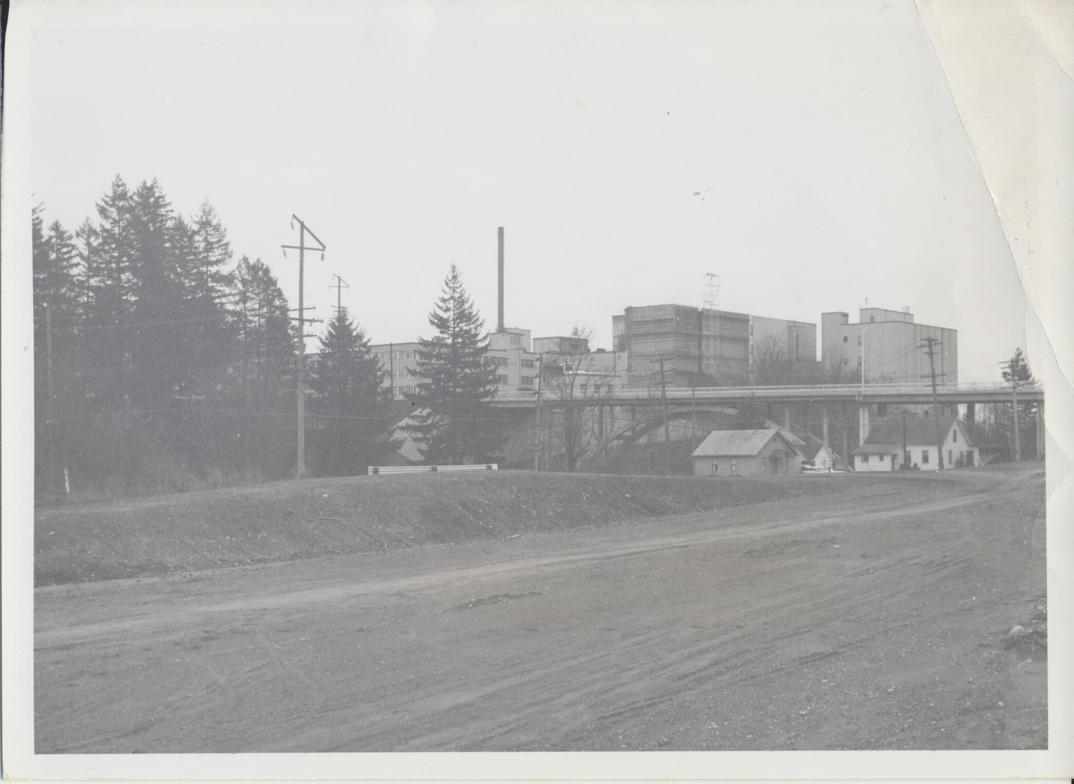 Photograph. I-5 construction. Looking southeast to Olympia brewery. Photographer is standing on graded bed for I-5. New Custer Way Bridge spans freeway bed in distance. "End of Mud Bay - Aberdeen junction - superhighway southbound."Name/Title