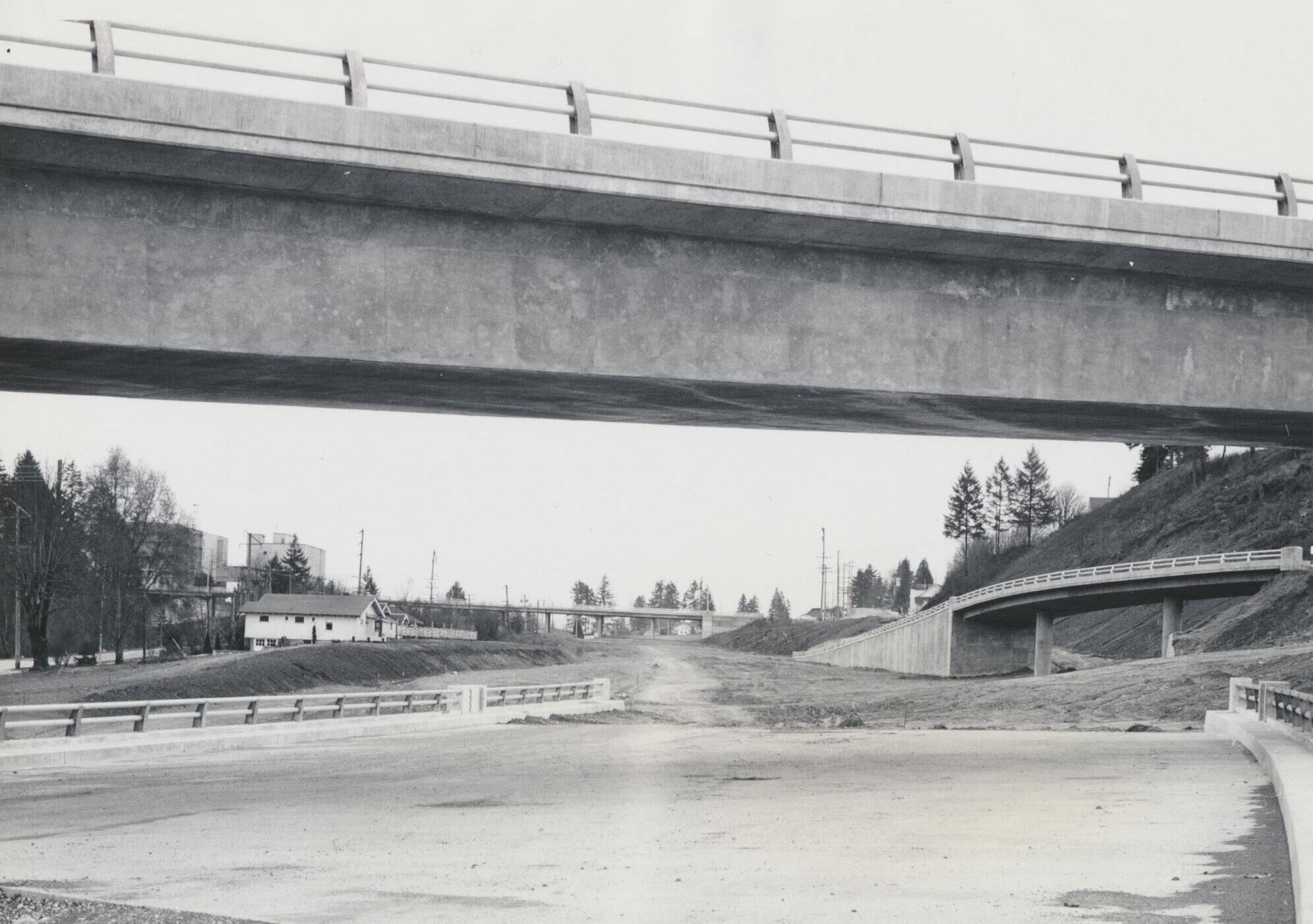 Photograph. I-5 construction. Looking south, with Olympia brewery on left in distance. Photographer is standing on graded bed of I-5. Overpass is Highway 101 ramp merging with I-5. "South lane Seattle-Portland overpass, Capitol Lake Road. Curved ramp Aberdeen traffic southbound. Top ramp Aberdeen traffic northbound. Note Second Avenue under curved ramp in background."Name/Title