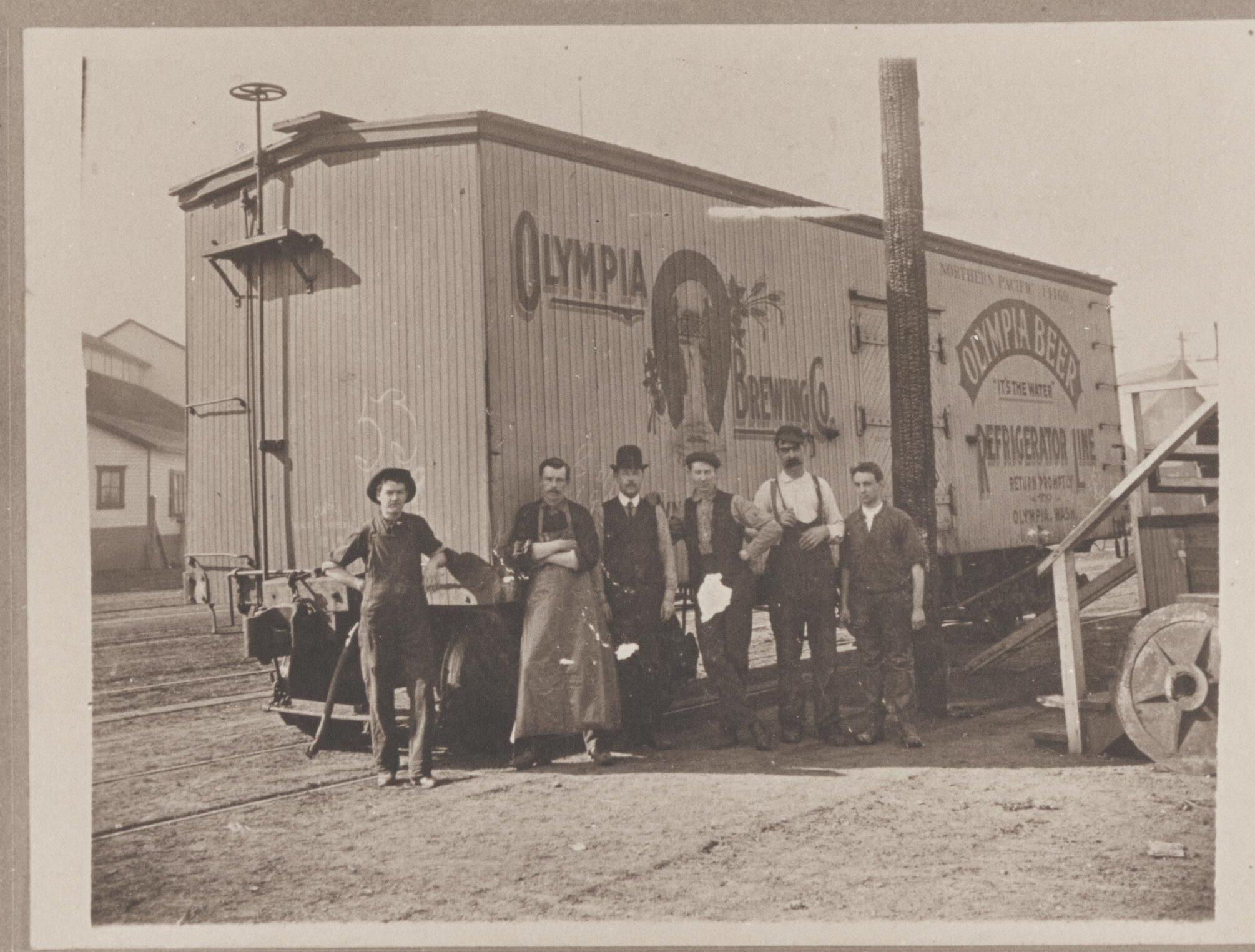 Photograph. Railroad car with Olympia beer logo. No ID on people. Photo was not taken at Olympia brewery; may be in Olympia or Seattle.