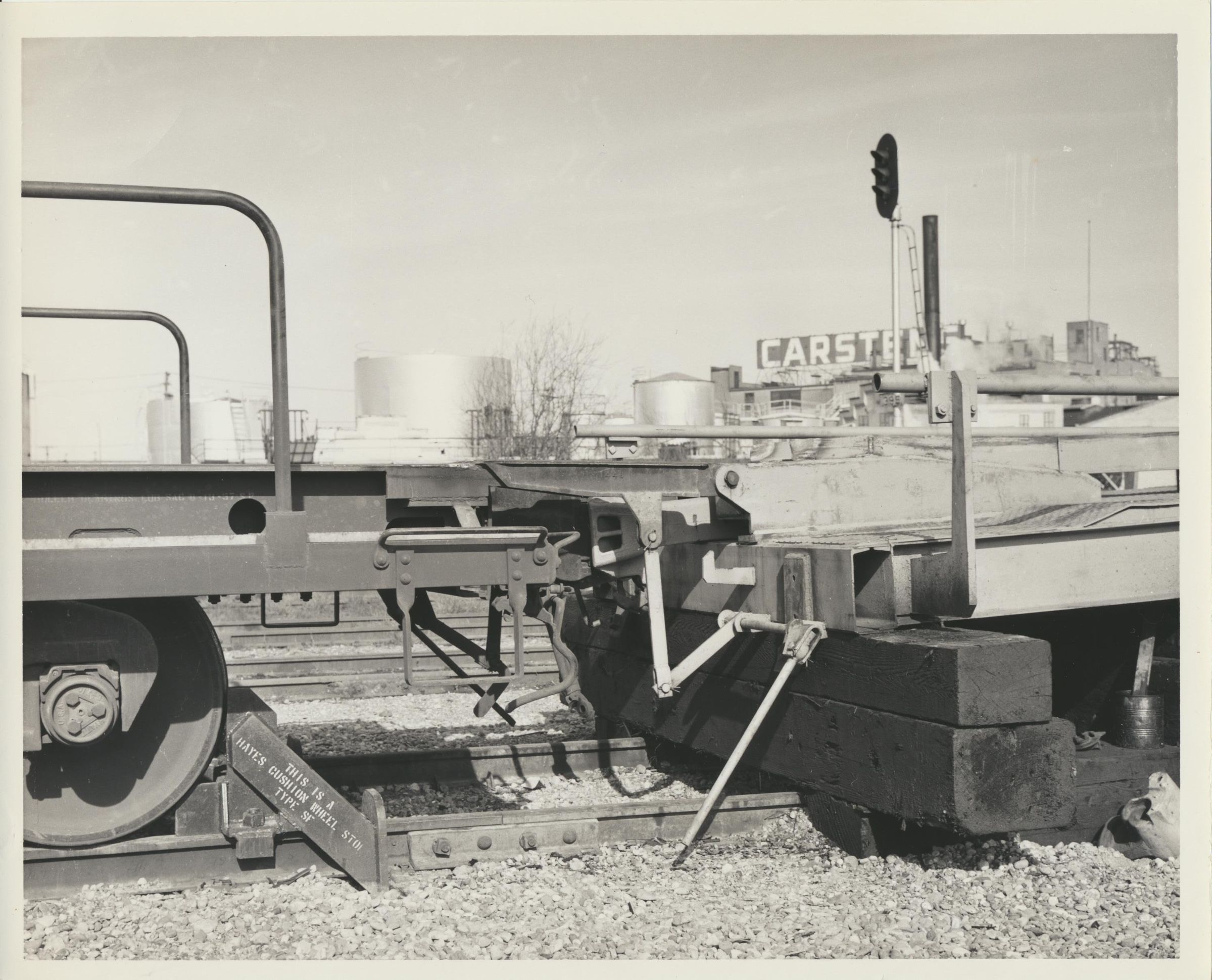 Photograph. Railroad car with loading ramp, for driving truck/trailer rigs onto flatcars. Building in distance is signed "Carstens" which is likely a Carstens meat packing plant in Tacoma or Seattle.Name/Title