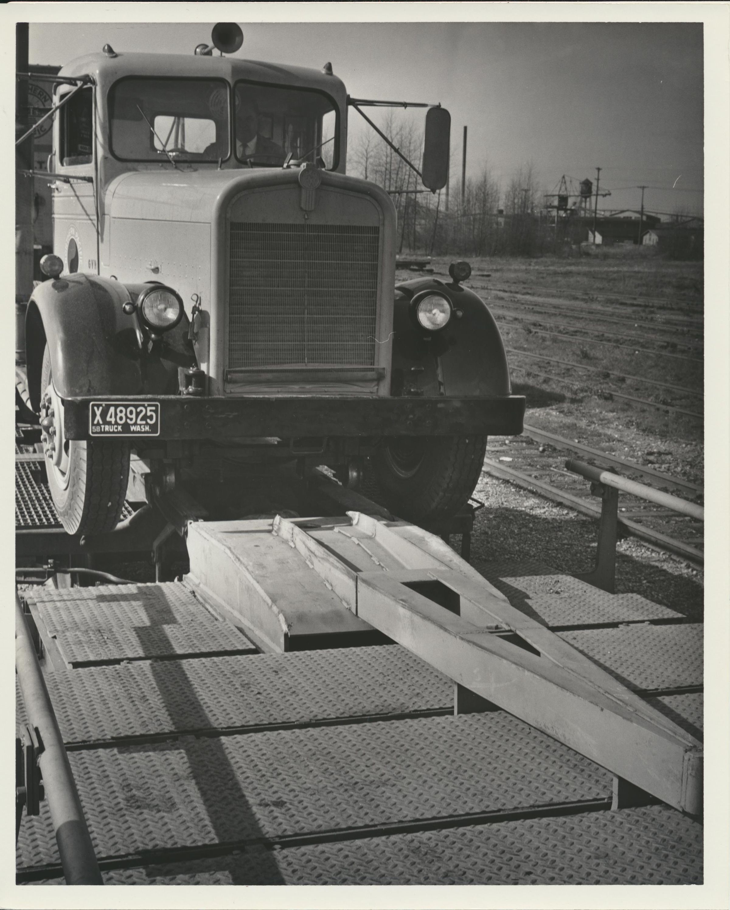 Photograph. Truck/trailer rig loading onto flatcar via loading ramp. Probably in Tacoma or Seattle.
