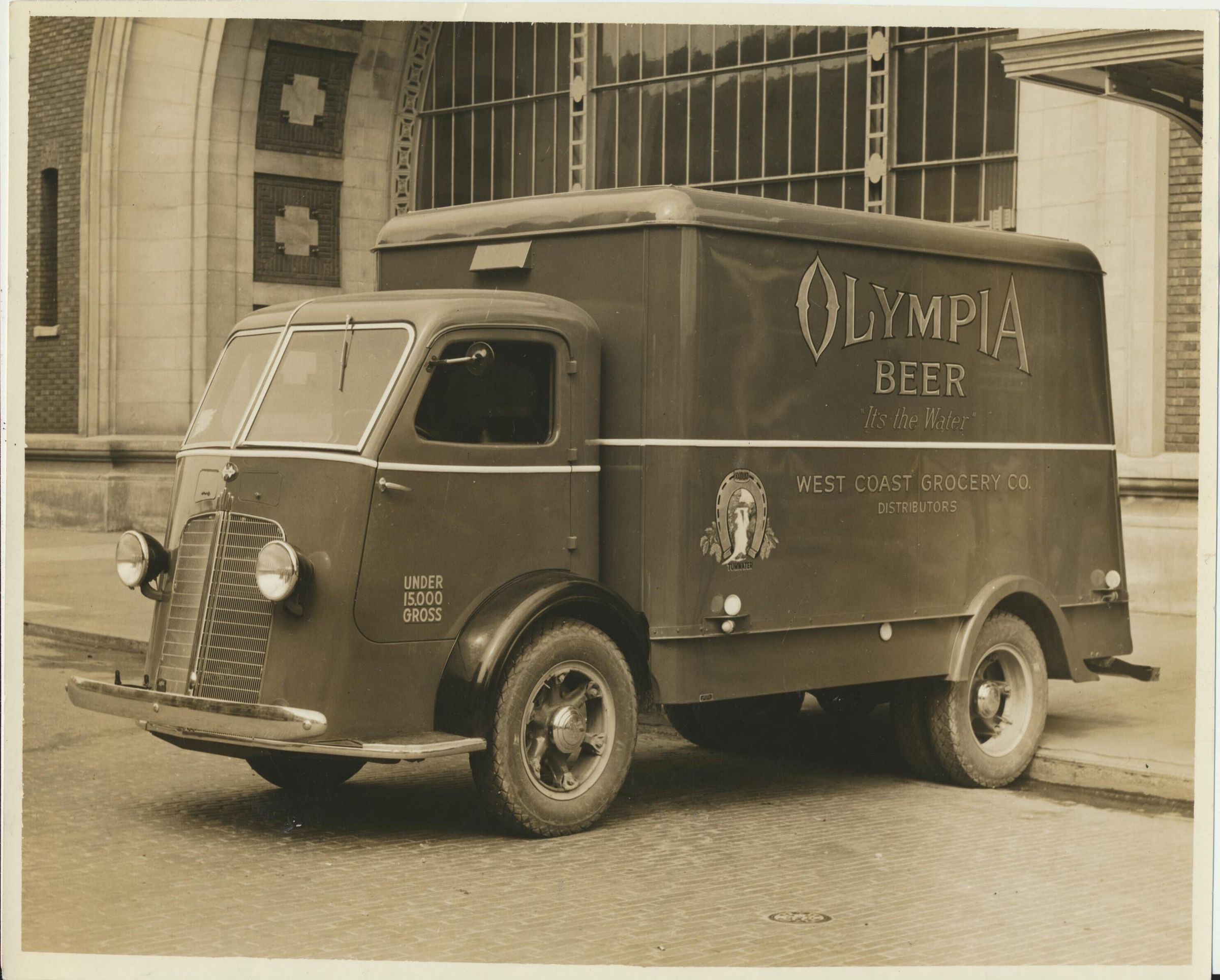 Photograph. The West Coast Grocery Company distributed Oly beer far and wide. Their 1936 International cab-over-engine truck was advertised as "a new truck for a new era" and sold for $695. Here, it's parked in front of Tacoma's Union Station railroad depot, built in 1911.Name/Title