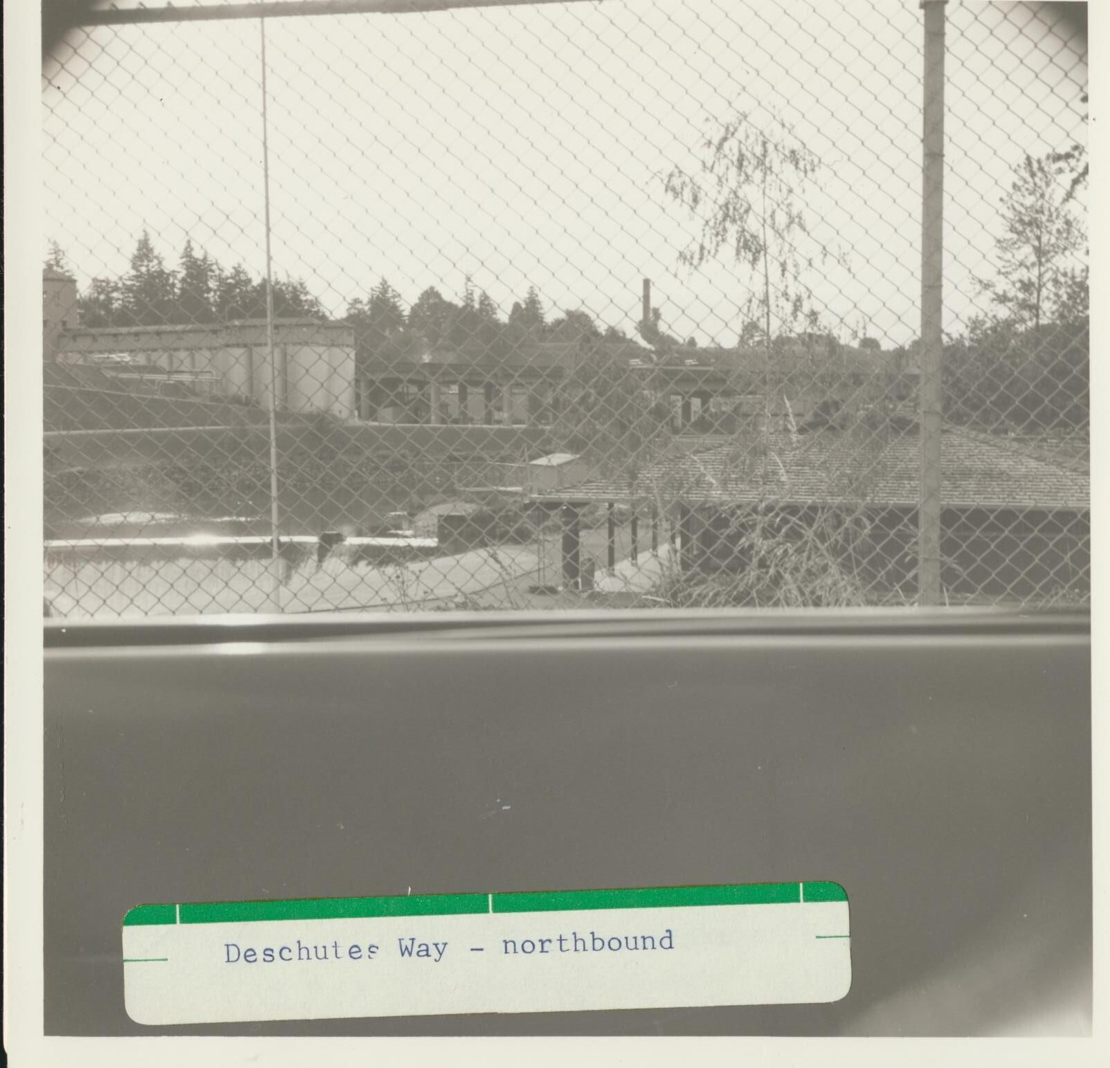 Photograph. Looking east at Tumwater Falls Park office and Olympia brewery from car northbound on Deschutes Way.