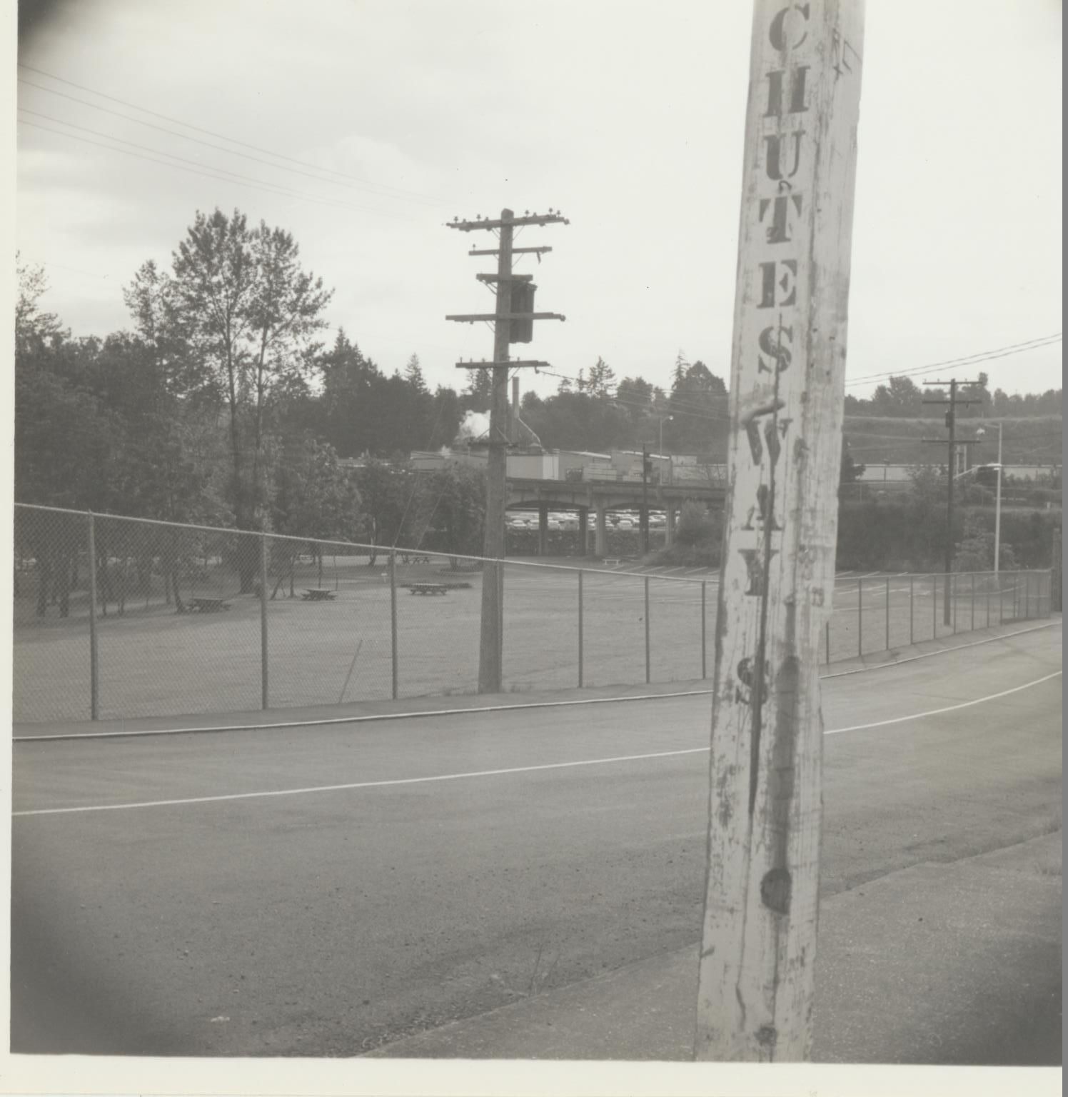 Photograph. Looking southeast at Tumwater Falls Park office and Olympia brewery warehouse area from car on Deschutes Way.