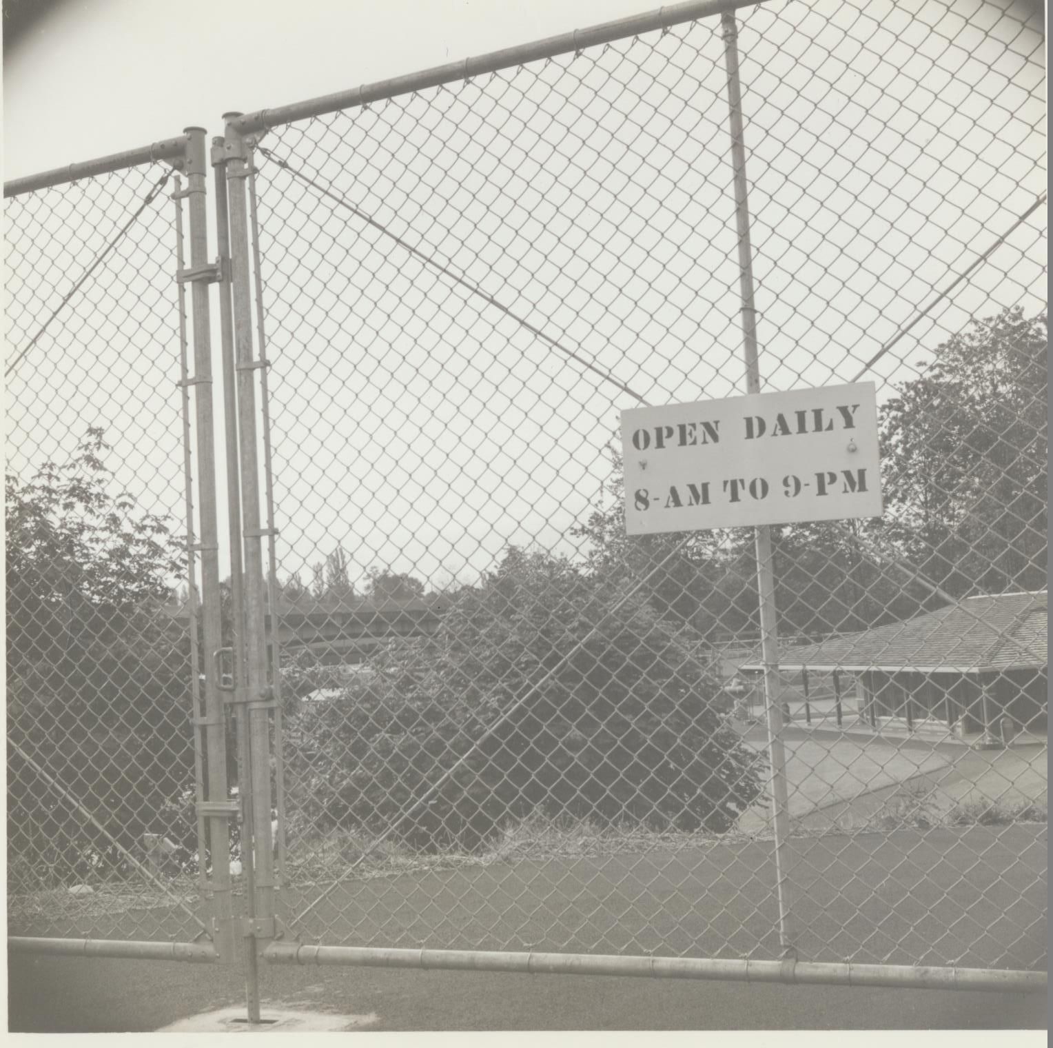 Photograph. Looking east at Tumwater Falls Park office from gate on Deschutes Way.