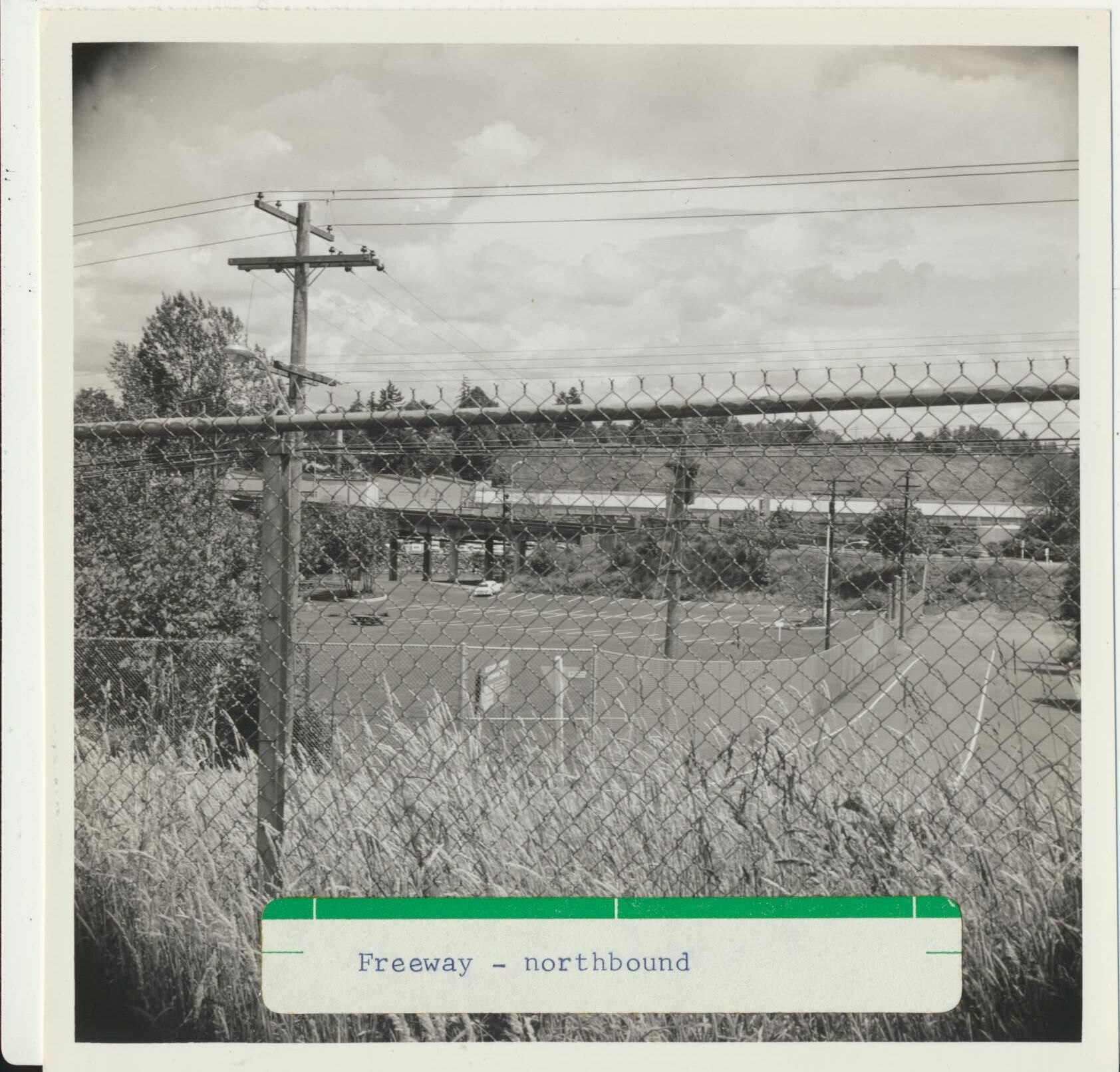 Photograph. Looking east across Tumwater Falls Park parking lot to warehouse area of Olympia brewery. Intersection of Deschutes Way and 2nd.