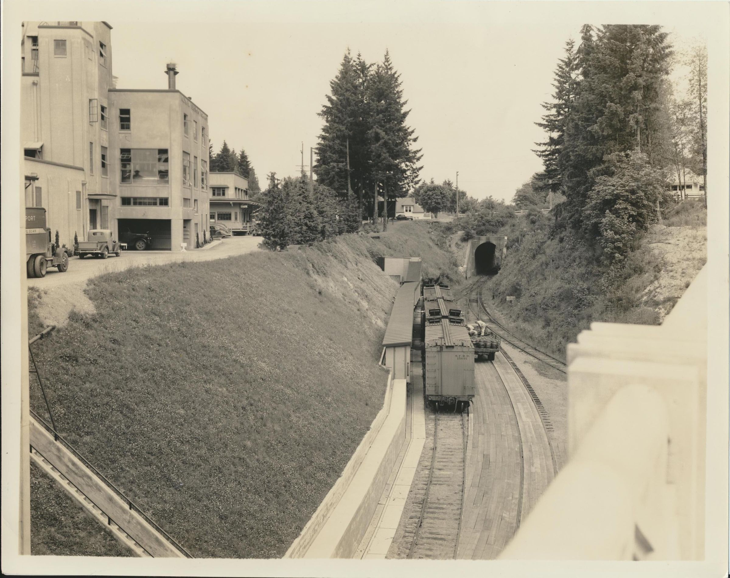 Photograph. Railroad cut on east side of Olympia brewery. Looking north.
