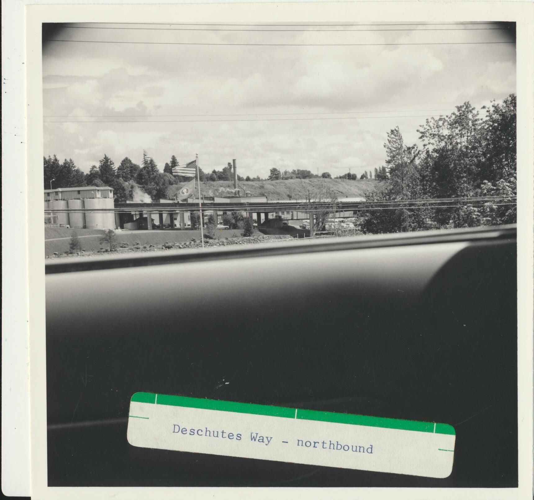Photograph. View of Olympia brewery warehouse area taken from car on Deschutes Way. Looking east.