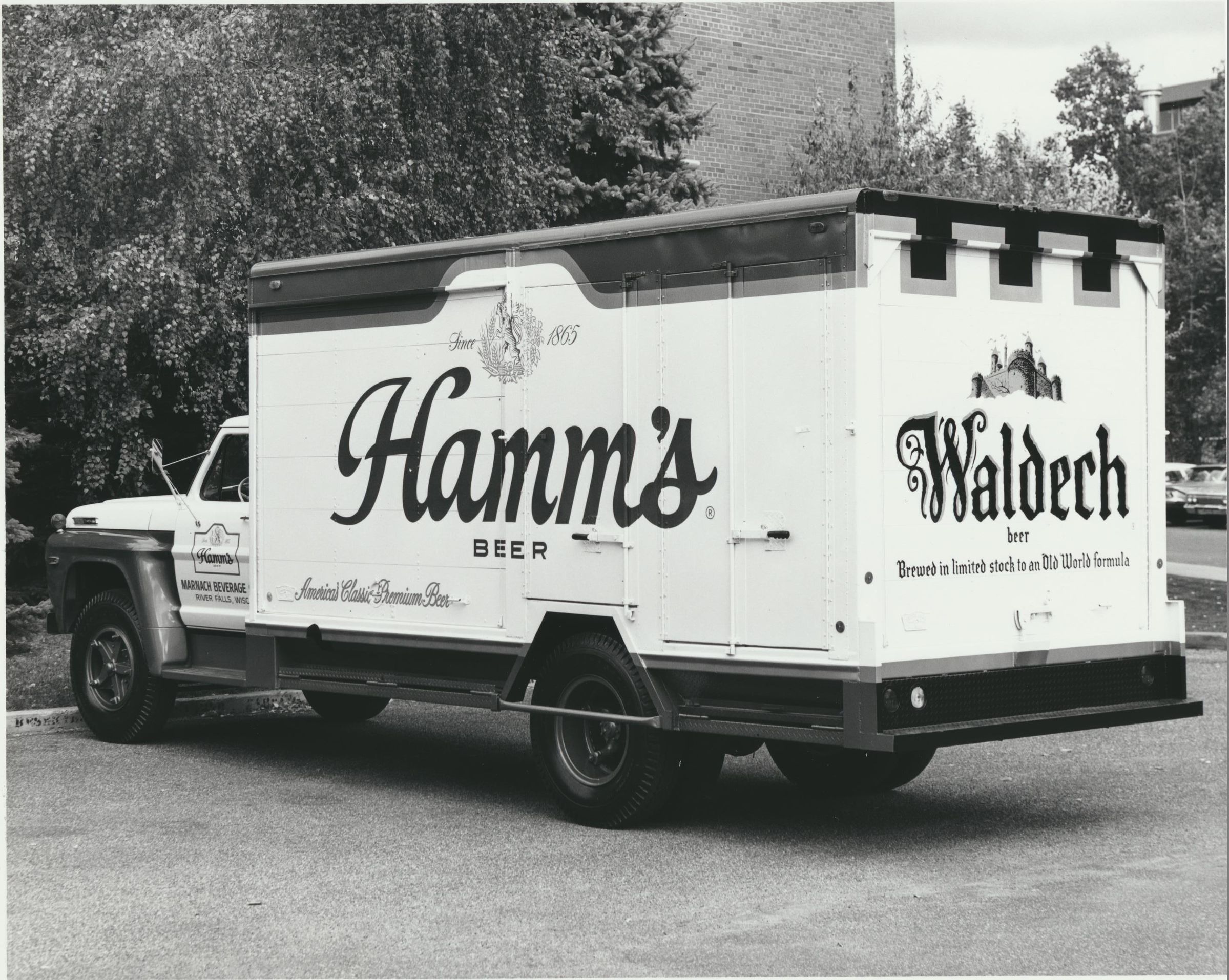Photograph. 1956 or 57 Ford truck, Hamm's beer logo on front and sides, Waldech beer logo on back. Truck owned by Marnach Beverage Company, River Falls, Wisconsin.