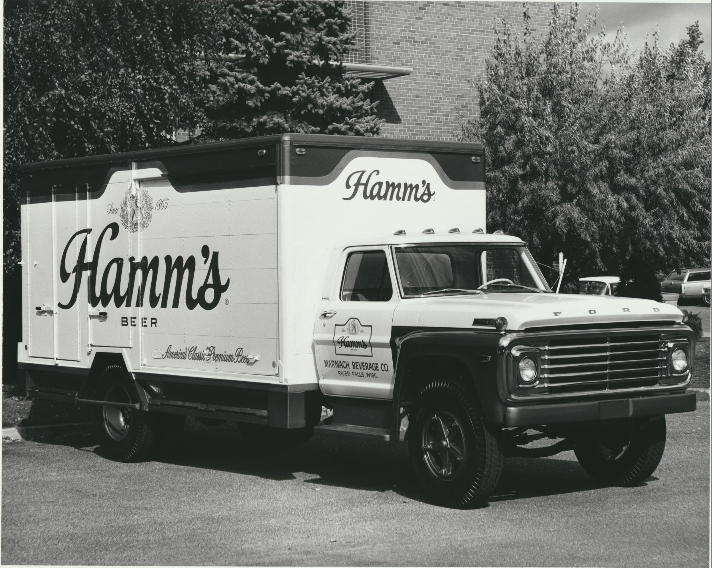 Photograph. 1956 or 57 Ford truck, Hamm's beer logo on front and sides, Waldech beer logo on back. Truck owned by Marnach Beverage Company, River Falls, Wisconsin.