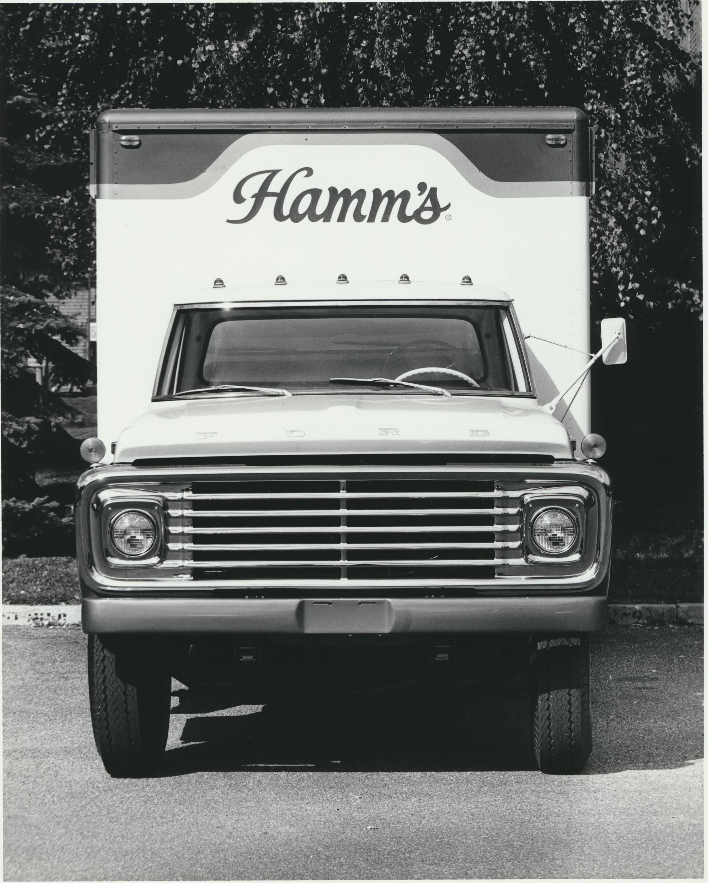 Photograph. 1956 or 57 Ford truck, Hamm's beer logo on front and sides, Waldech beer logo on back. Truck owned by Marnach Beverage Company, River Falls, Wisconsin.