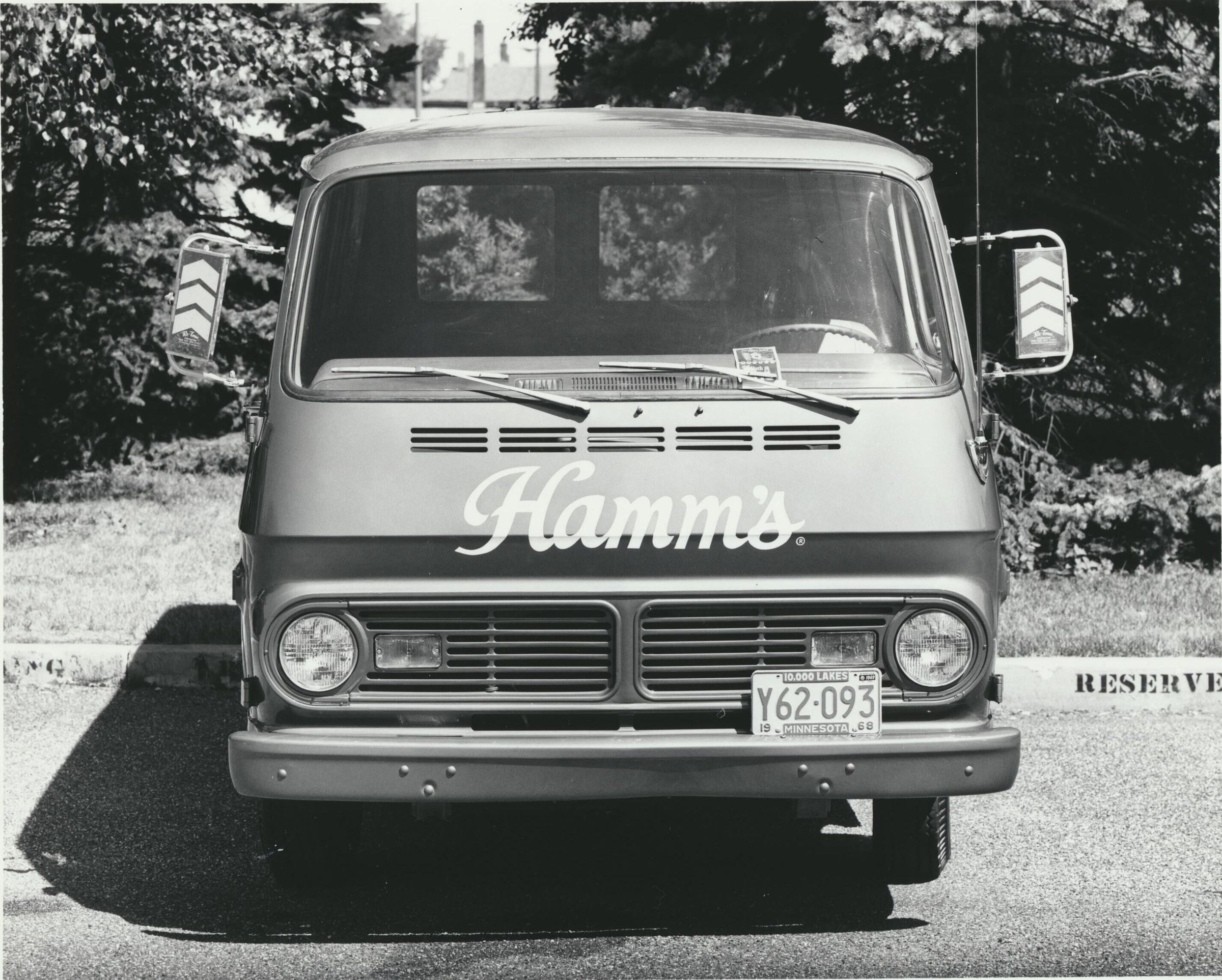 Photograph. 1968 Chevrolet van, with Hamm's beer logo. Van owned by Alcorn Beverage Company, South St. Paul MN.
