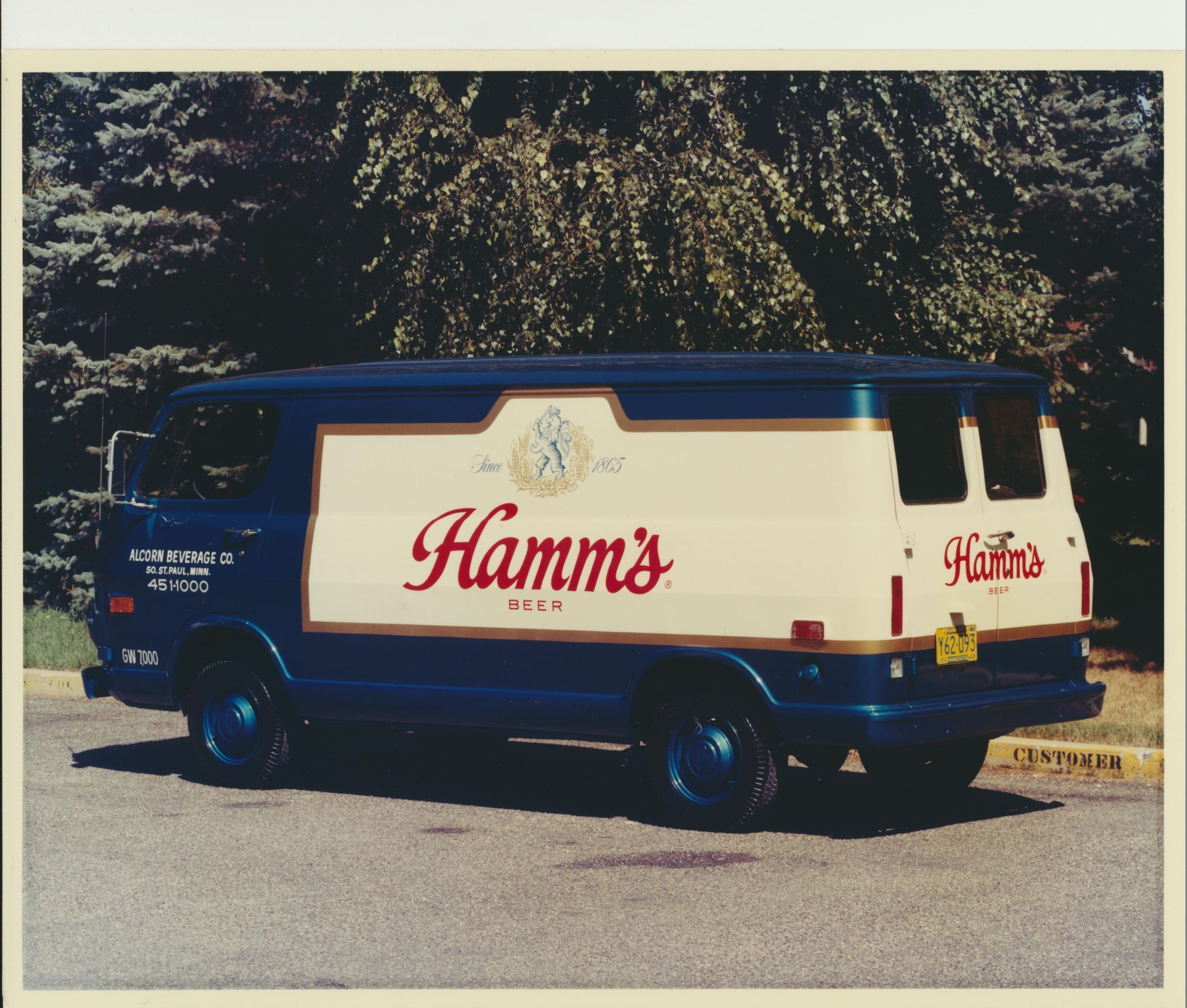 Photograph. 1968 Chevrolet van, with Hamm's beer logo. Van owned by Alcorn Beverage Company, South St. Paul MN.