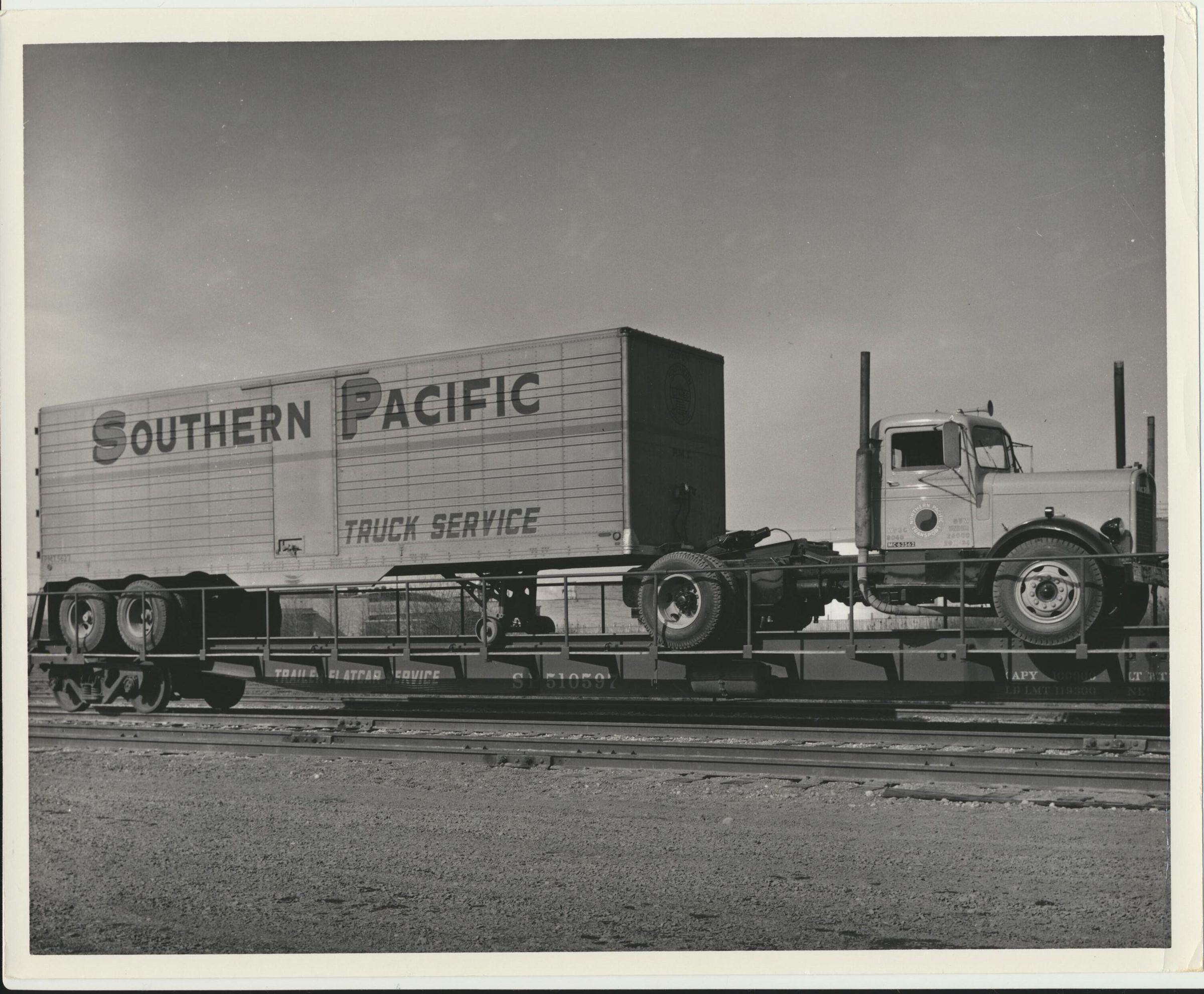 Photograph. Truck/trailer loaded onto flatcar for shipping. Probably in Tacoma or Seattle.