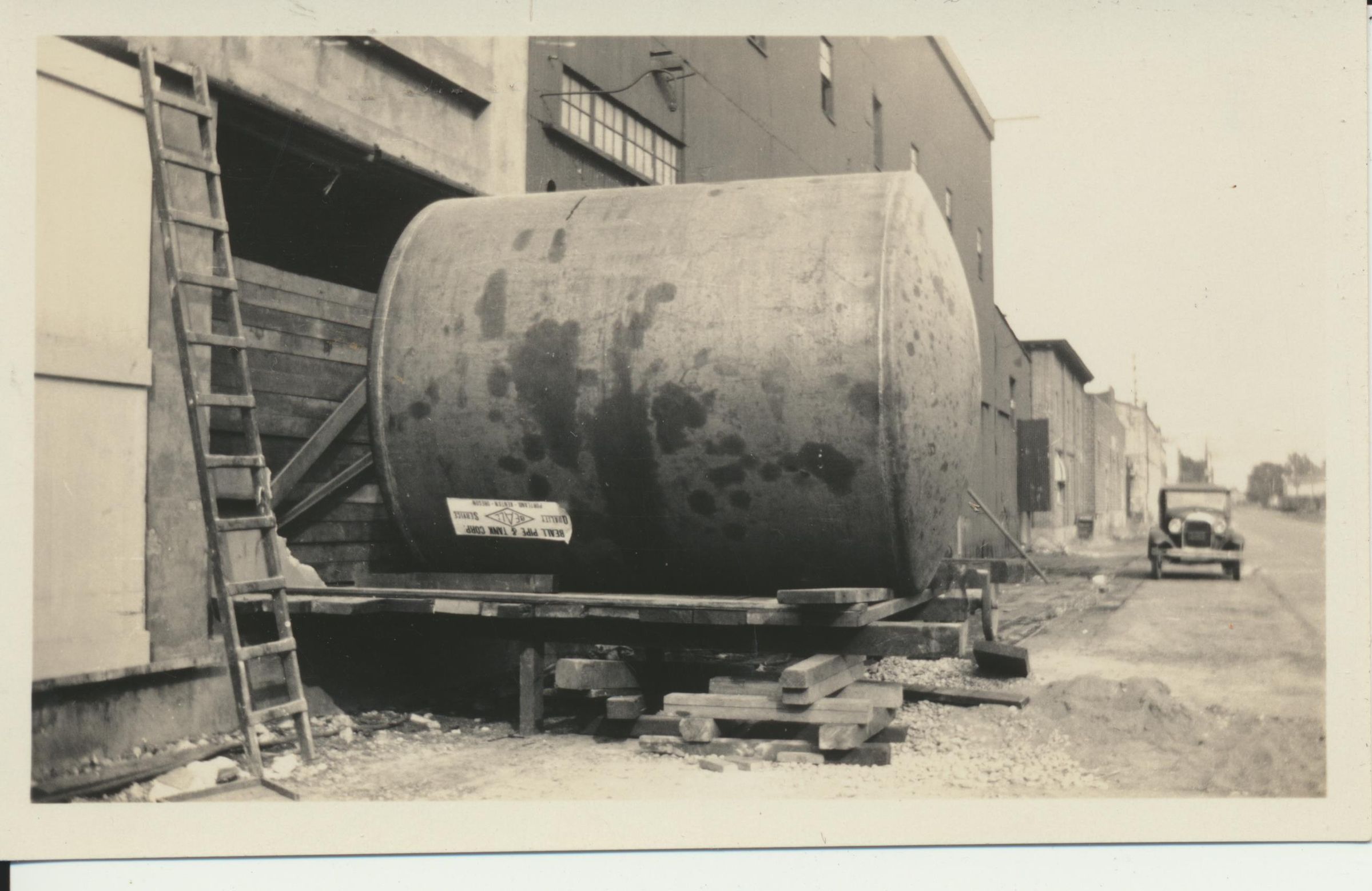 Photograph. Moving tank into brewery, Salem OR. May be for beer or for fruit juice, when brewery converted to Loju processing.