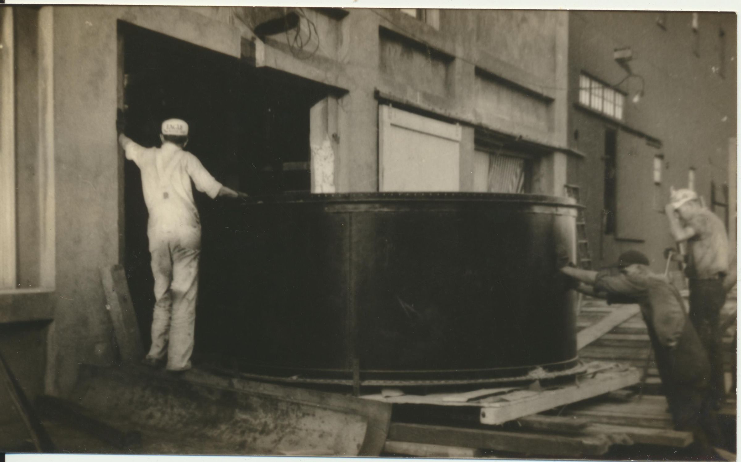 Photograph. Moving tank into brewery, Salem OR. May be for beer or for fruit juice, when brewery converted to Loju processing.