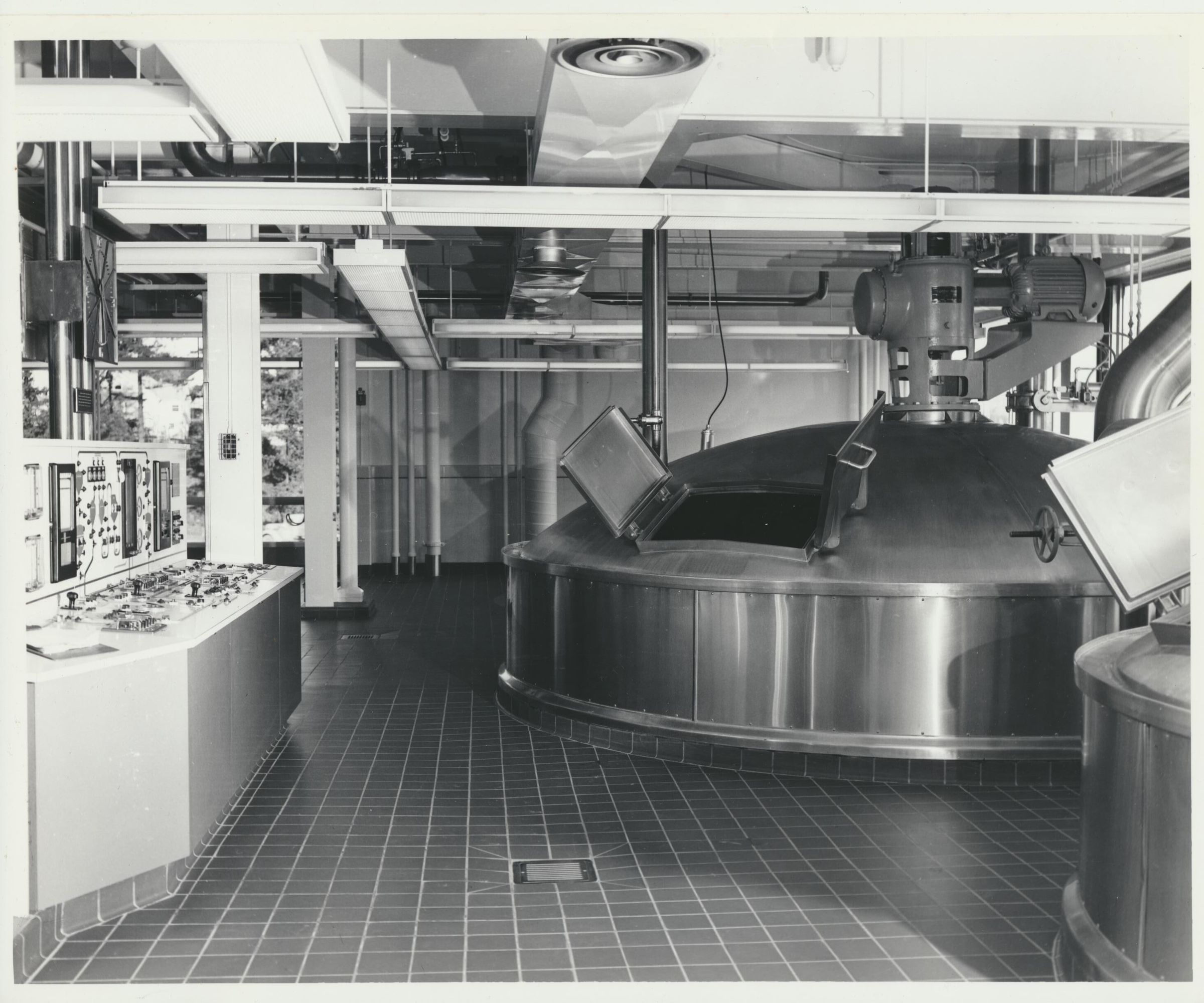 Photograph. B-brewhouse control panel in Olympia brewery. Controlled equipment on brewing floor. Main mash vessel on right.