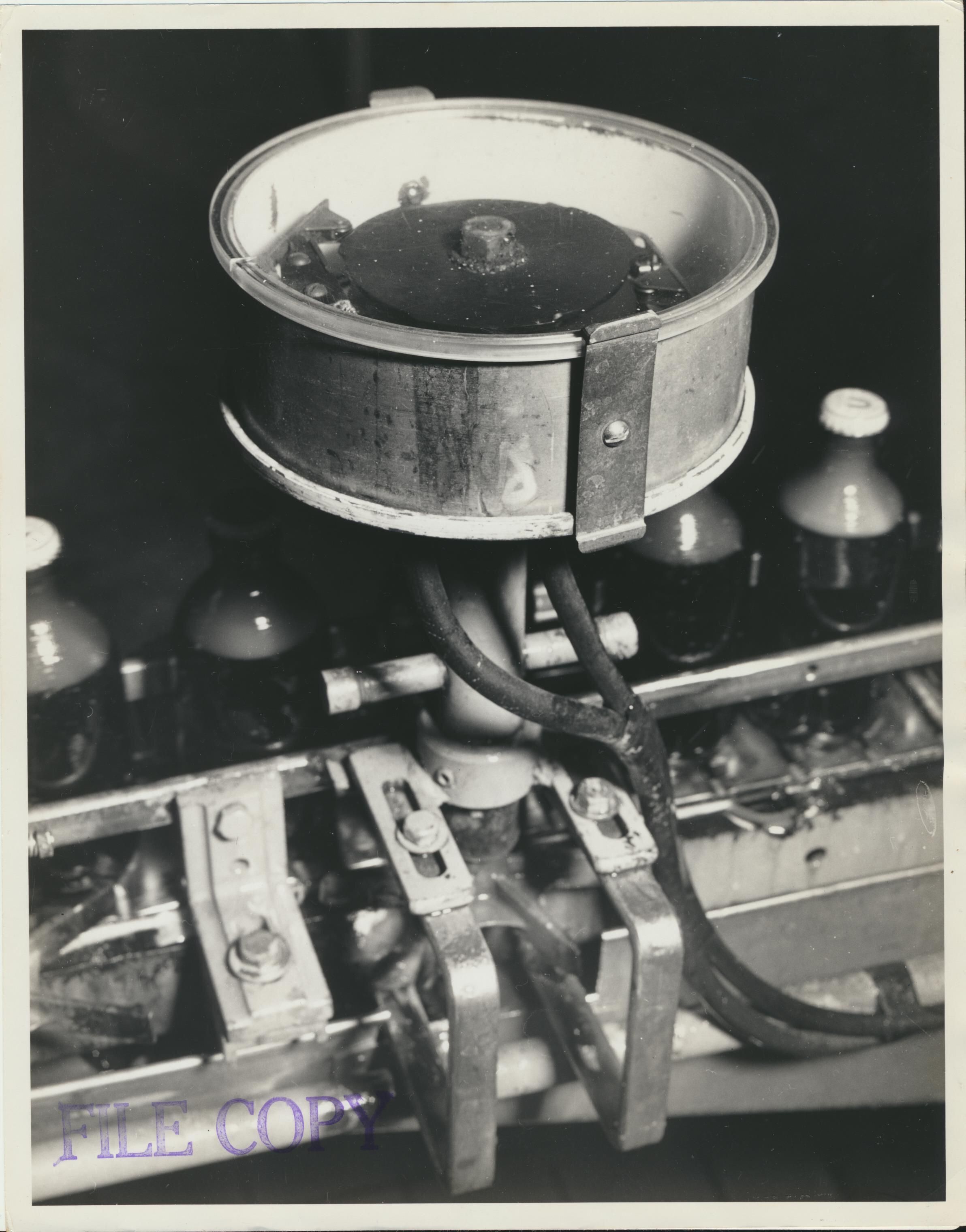 Photograph. Bottling operation at Olympia brewery. Device shown may be a lubricator for conveyor.