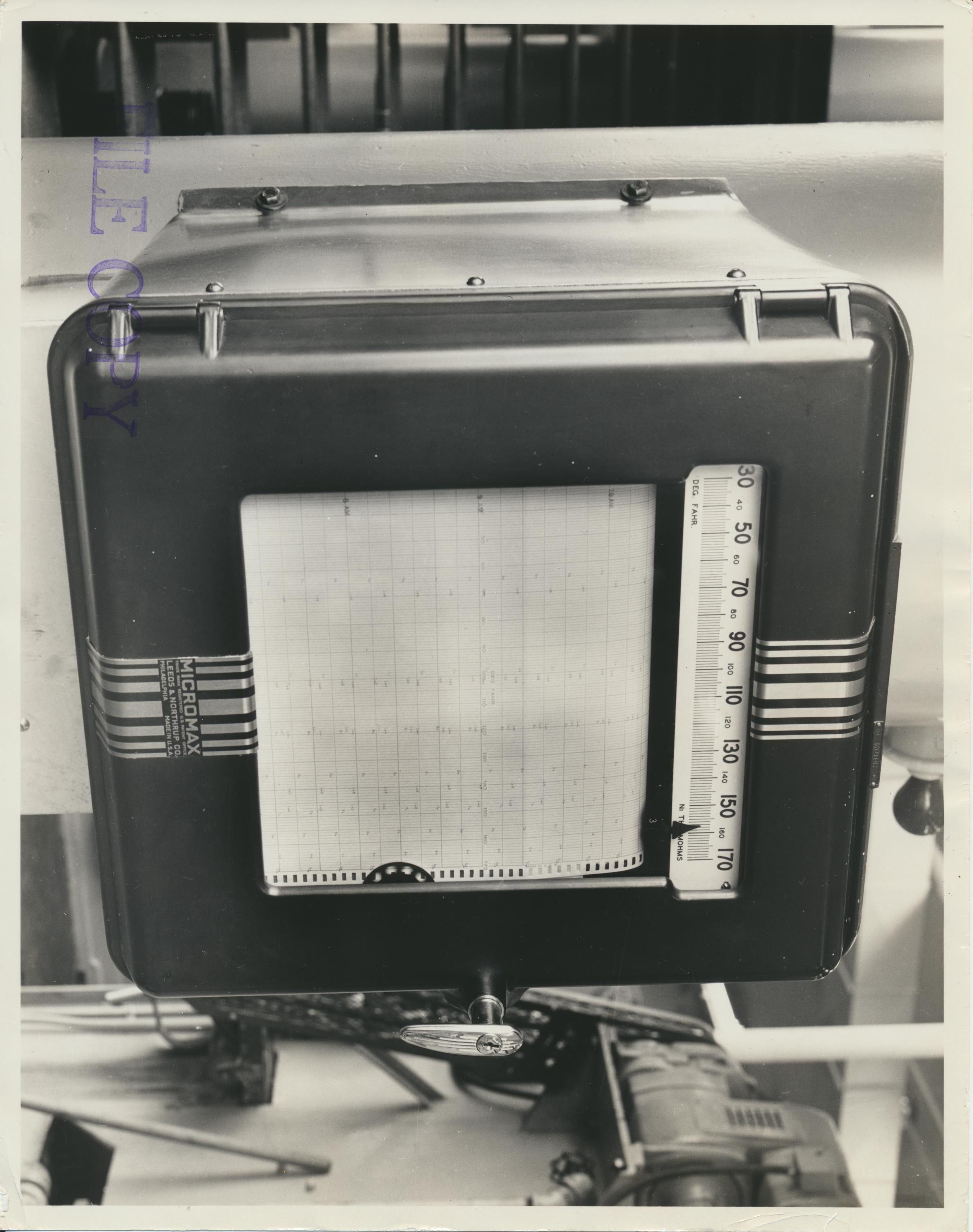Photograph. Temperature recording chart for pasteurizer at Olympia brewery.