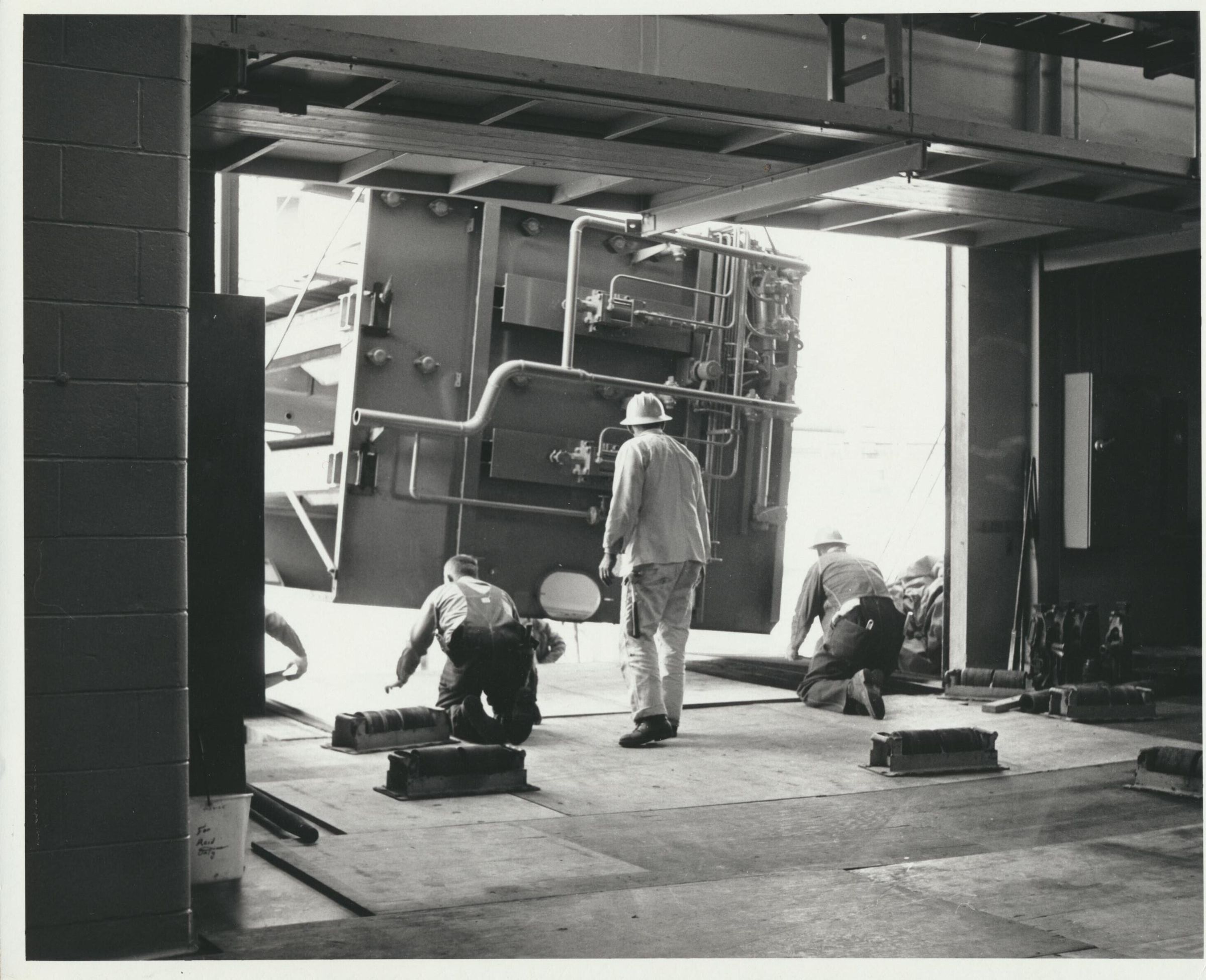Photograph. Installing tanks for pasteurizer in B-4 bottling line in valley complex at Olympia brewery.