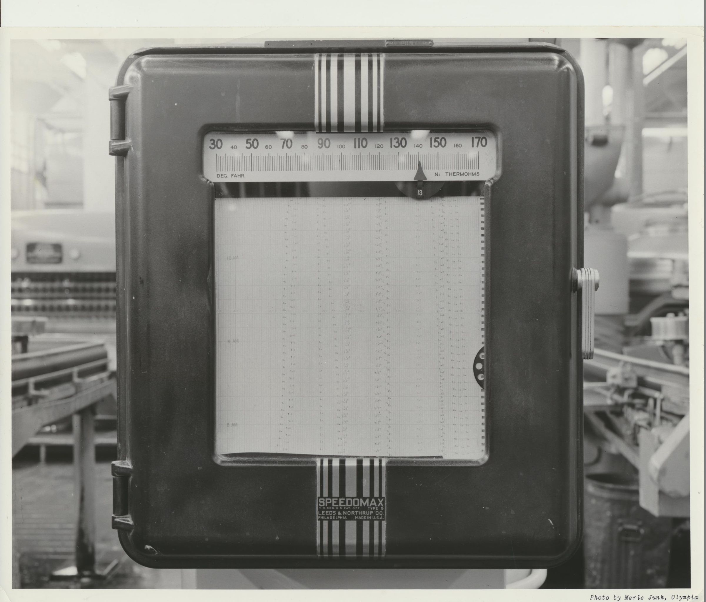 Photograph. Temperature recording chart for pasteurizer at Olympia brewery.