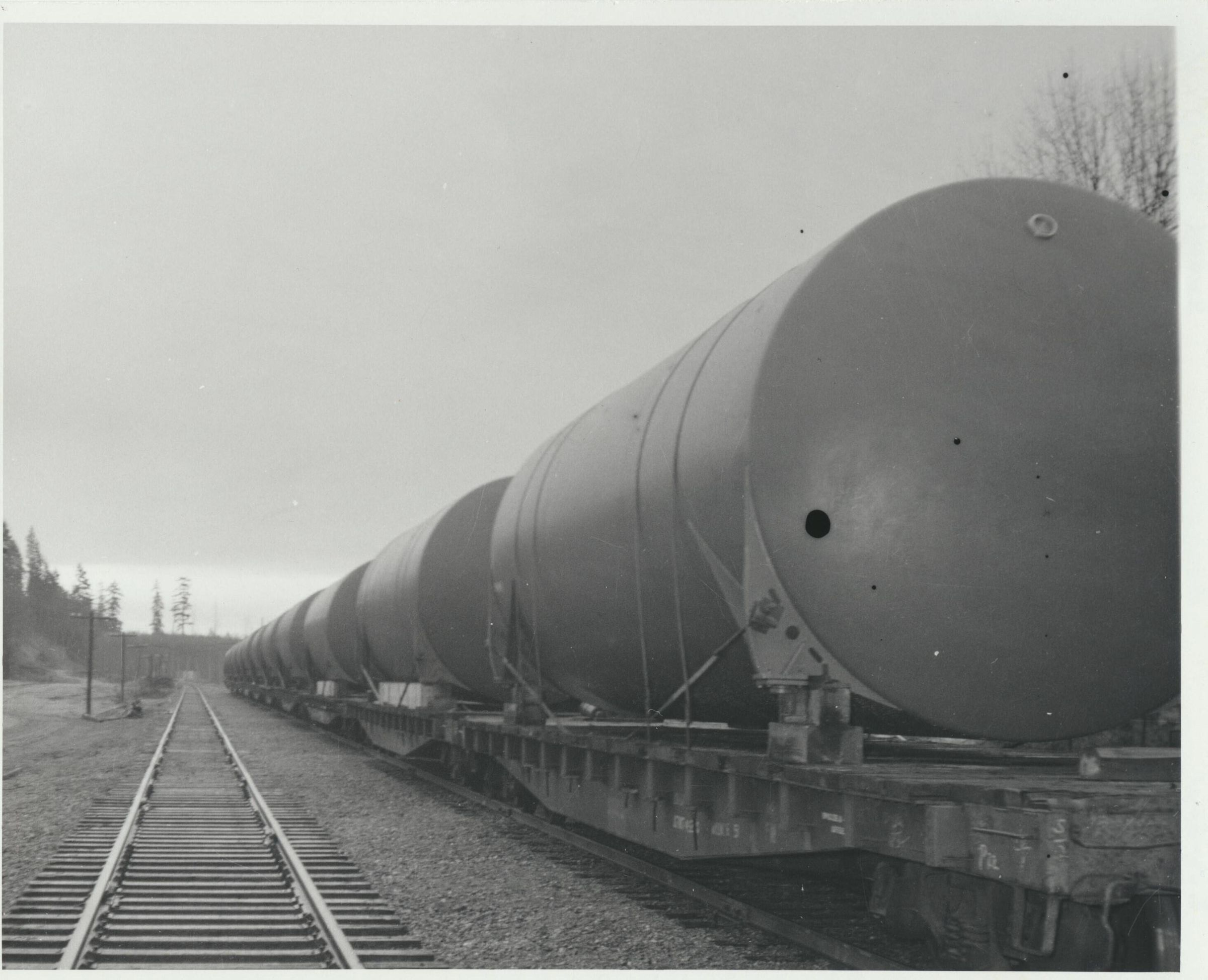 Photograph. Tanks for K cellar. Shown in unknown location, on way to Olympia brewery.