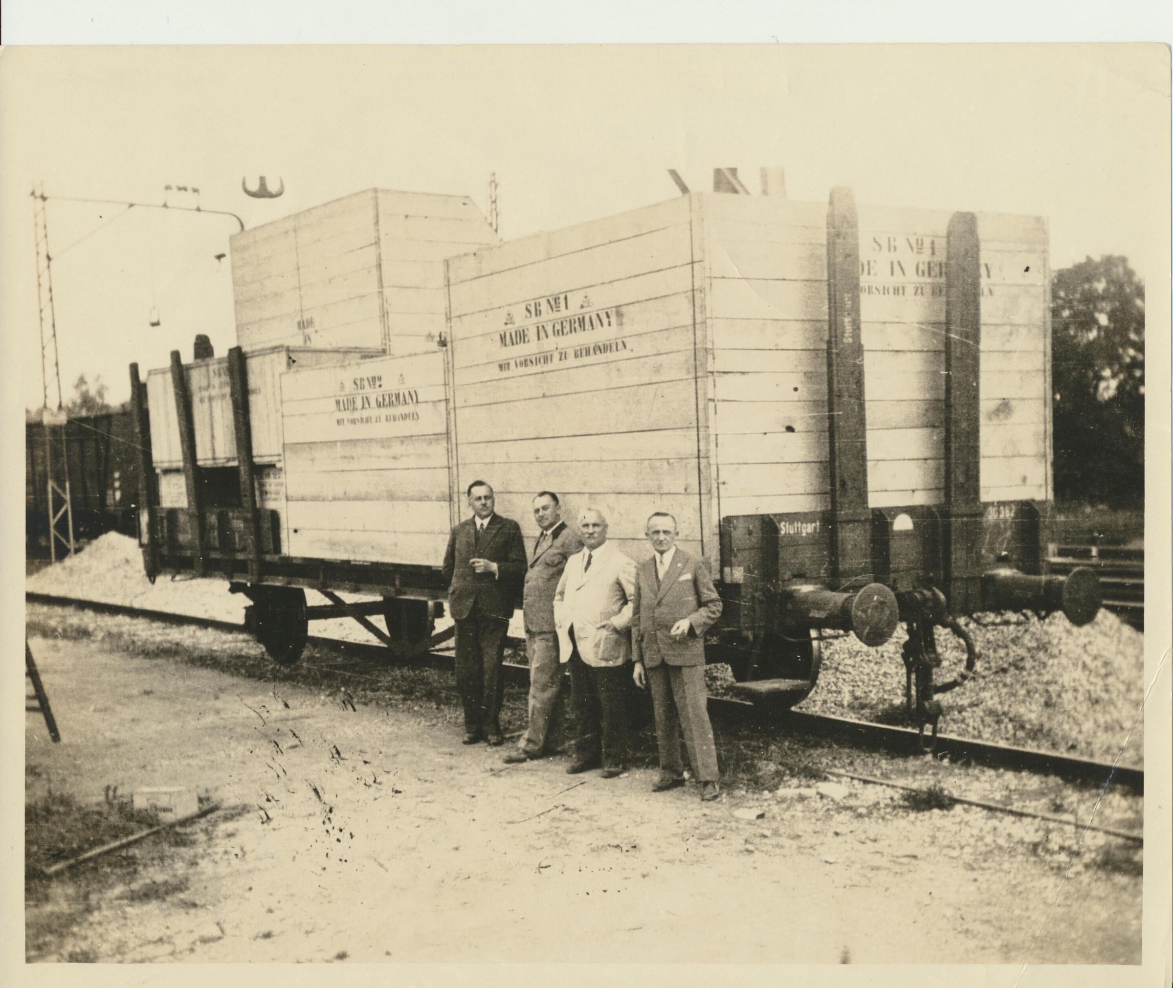 Photograph. Steinecker brewing equipment (50 barrel size) from Germany packed for shipment to Salem OR plant, 1933-34, which was being reworked for beer brewing upon repeal of Prohibition. No ID on men.