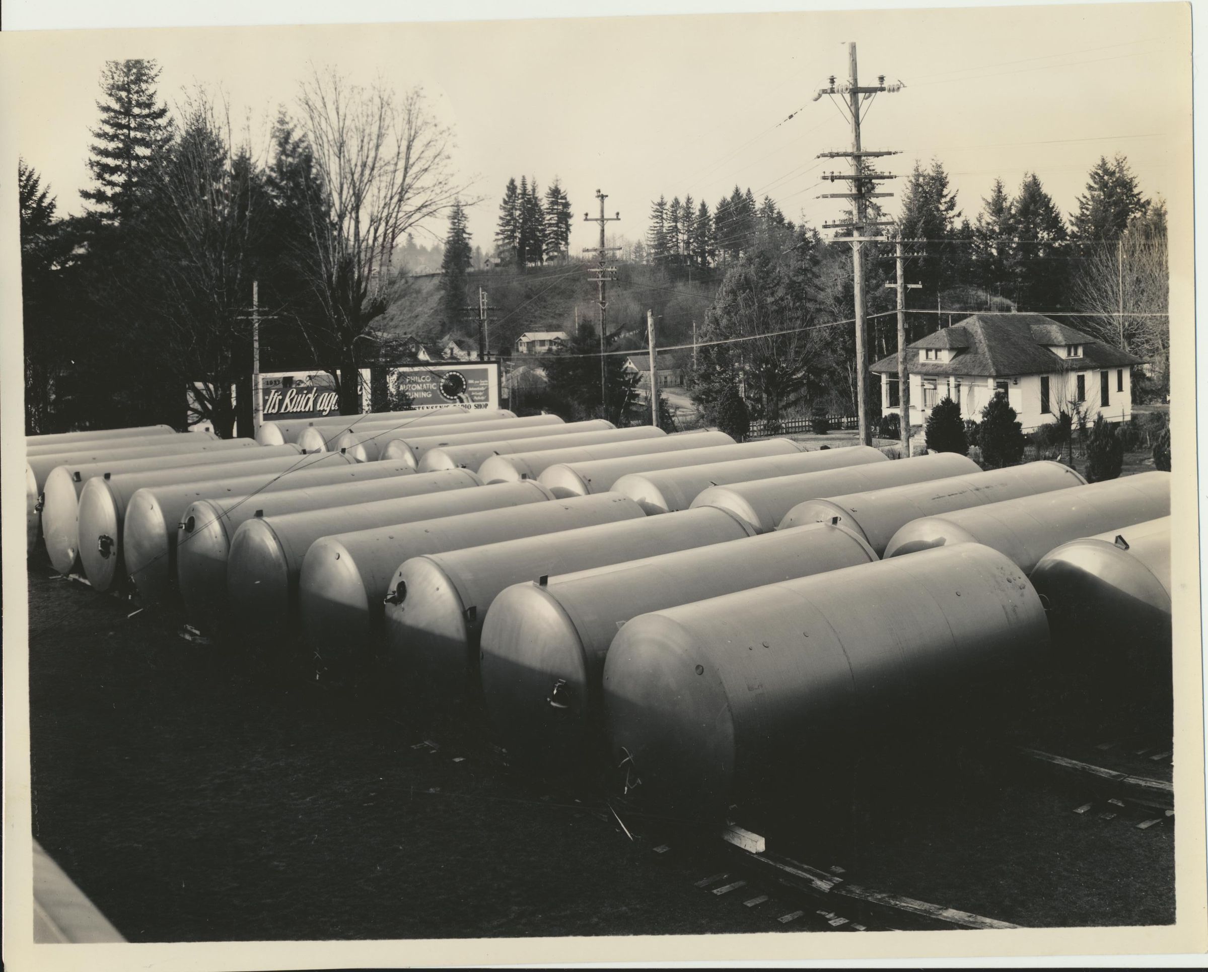 Photograph. Tanks waiting to go into K or M cellar at Olympia brewery.