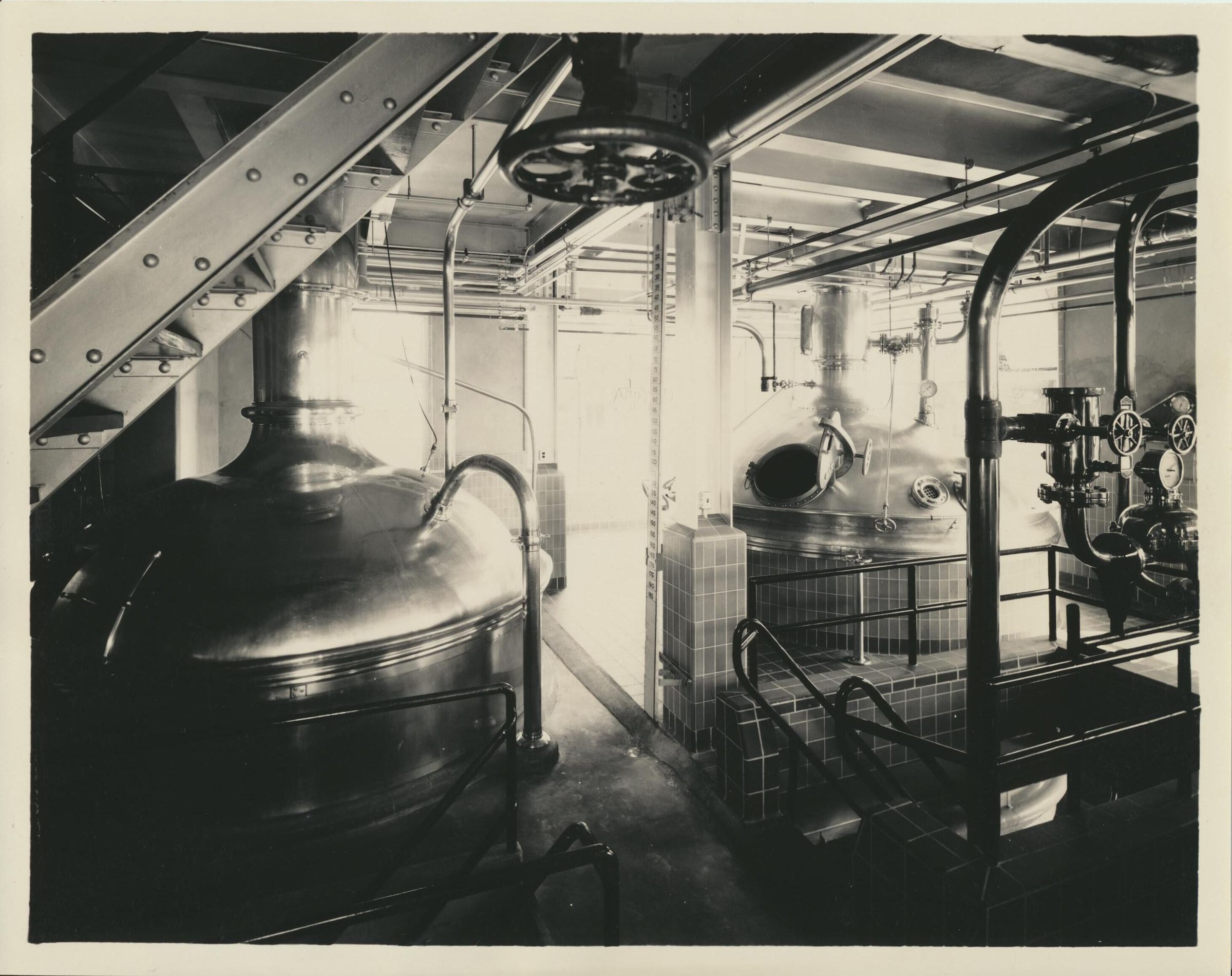 Photograph. Copper brew kettle at Olympia brewery. Vessel on right may be a cooker. The kettle on left is probably the one now at Tumwater City Hall.