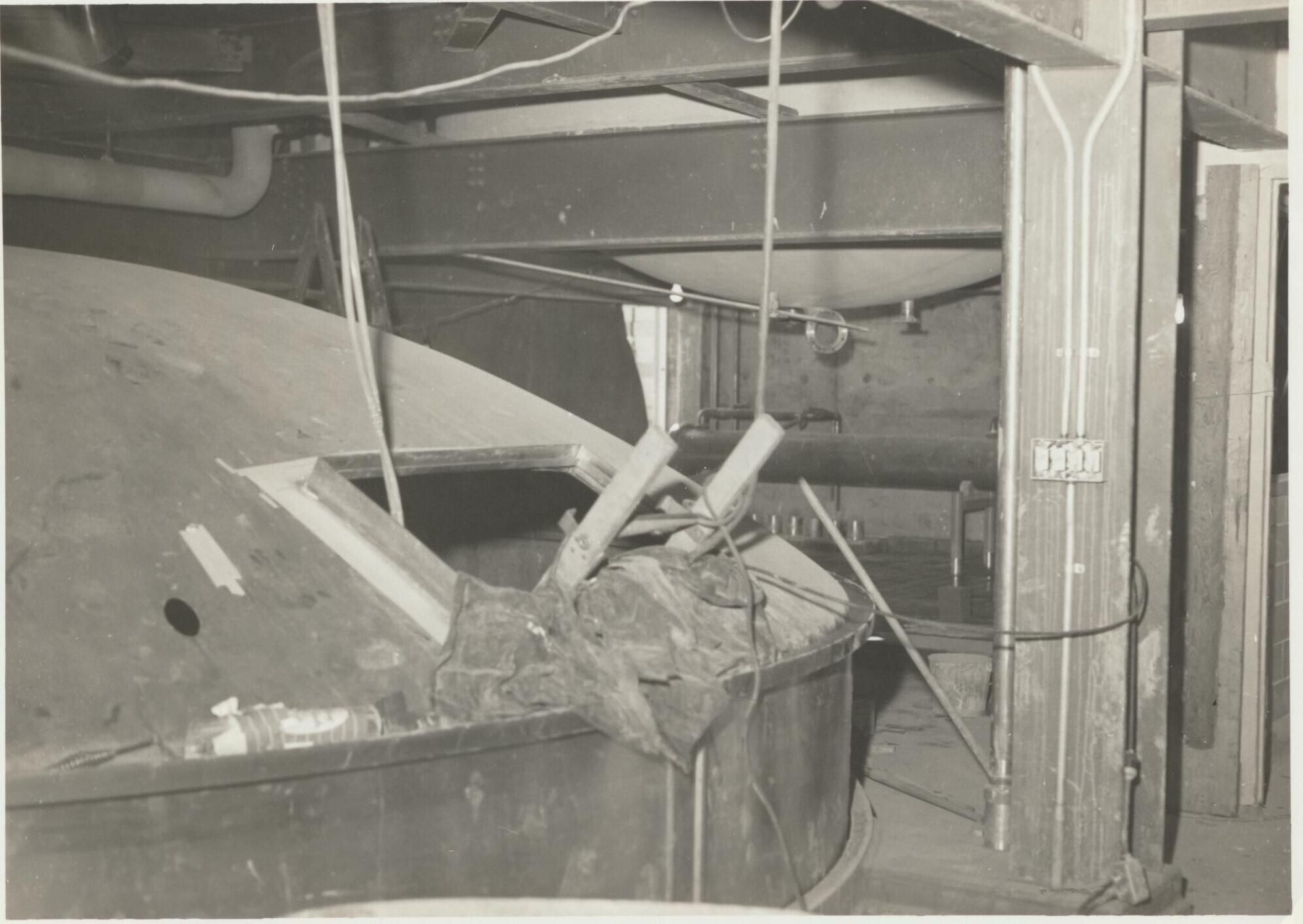 Photograph. Cooker or other vessel being made/installed at Olympia brewery.