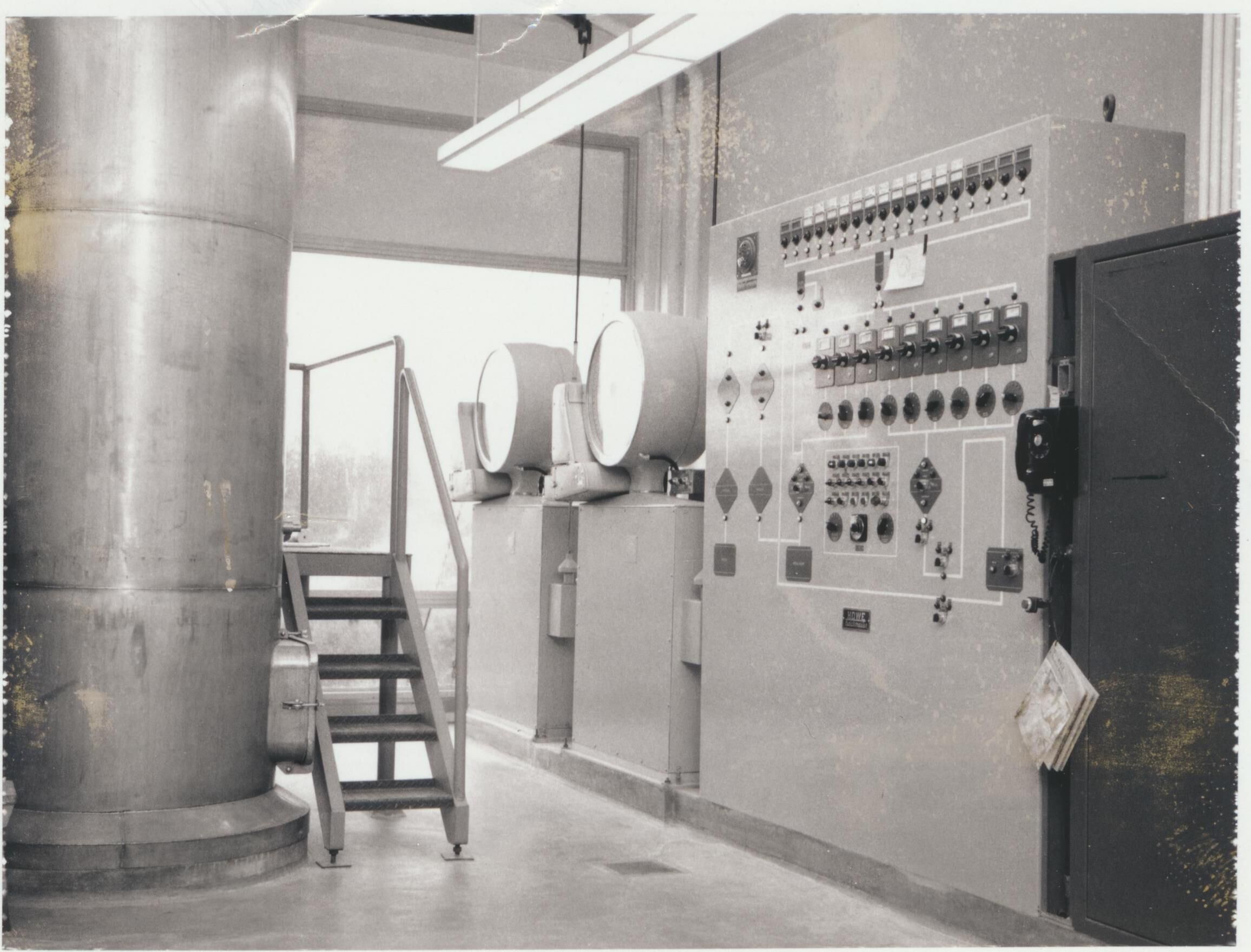 Photograph. Scales in B brewhouse at Olympia brewery. One scale is for malt, other for rice or corn grits.