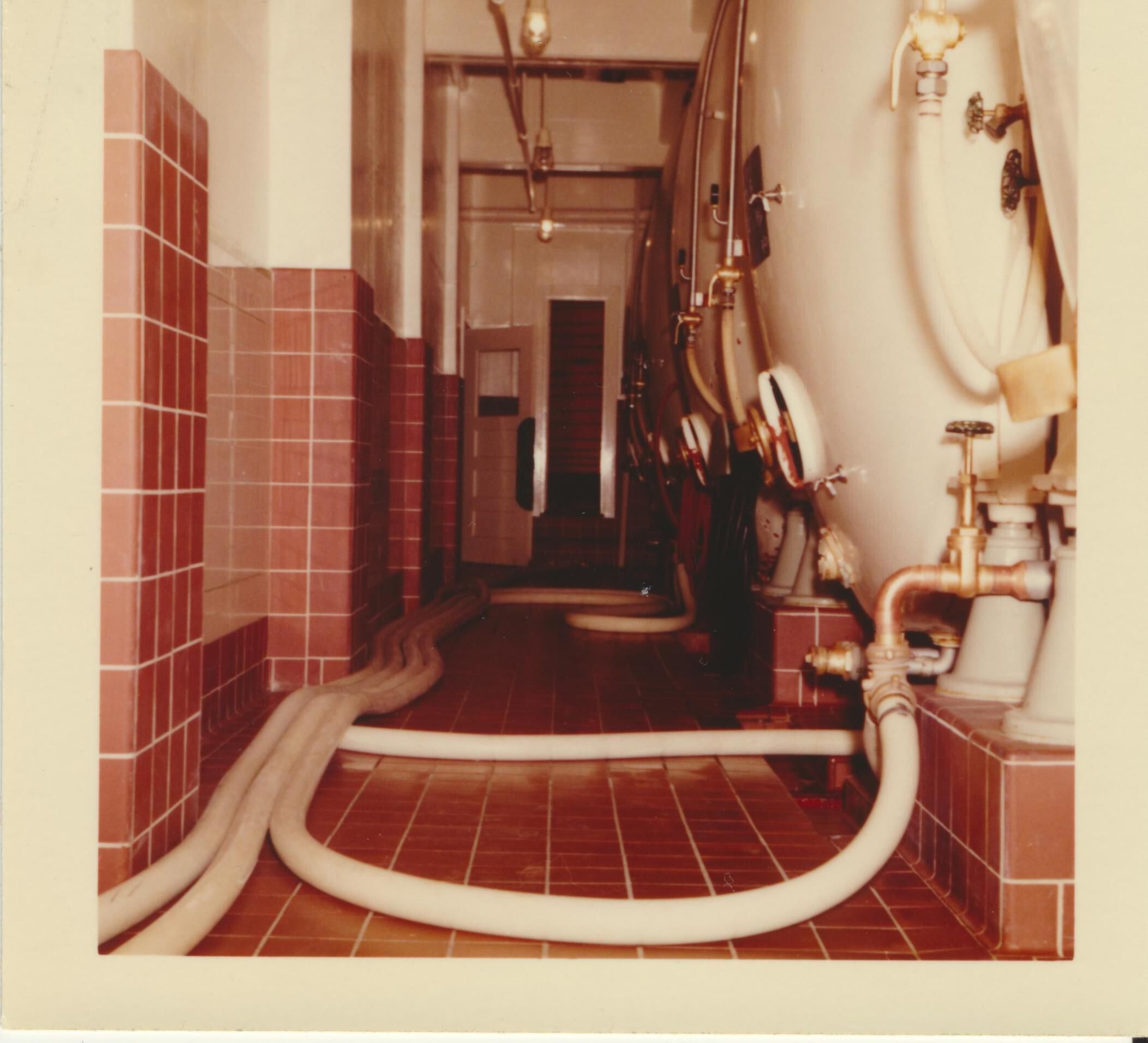 Photograph. Typical cellar scene with beer tanks, probably K cellar, at Olympia brewery.