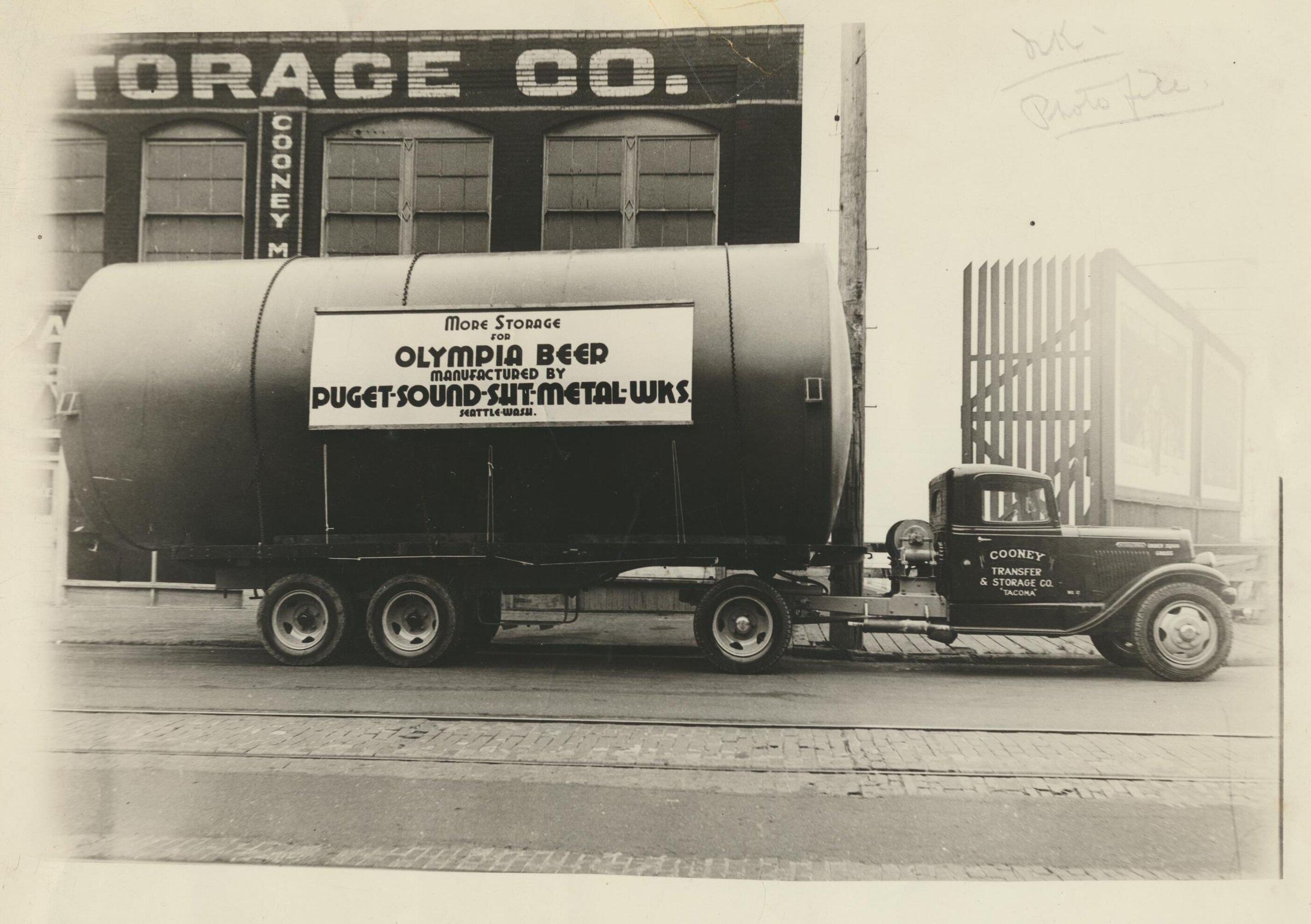 Photograph. Storage tank being moved by Cooney Transfer & Storage Co, Tacoma, to Olympia brewery. Tank was manufactured by Puget Sound Sheet Metal Works, Seattle WA.