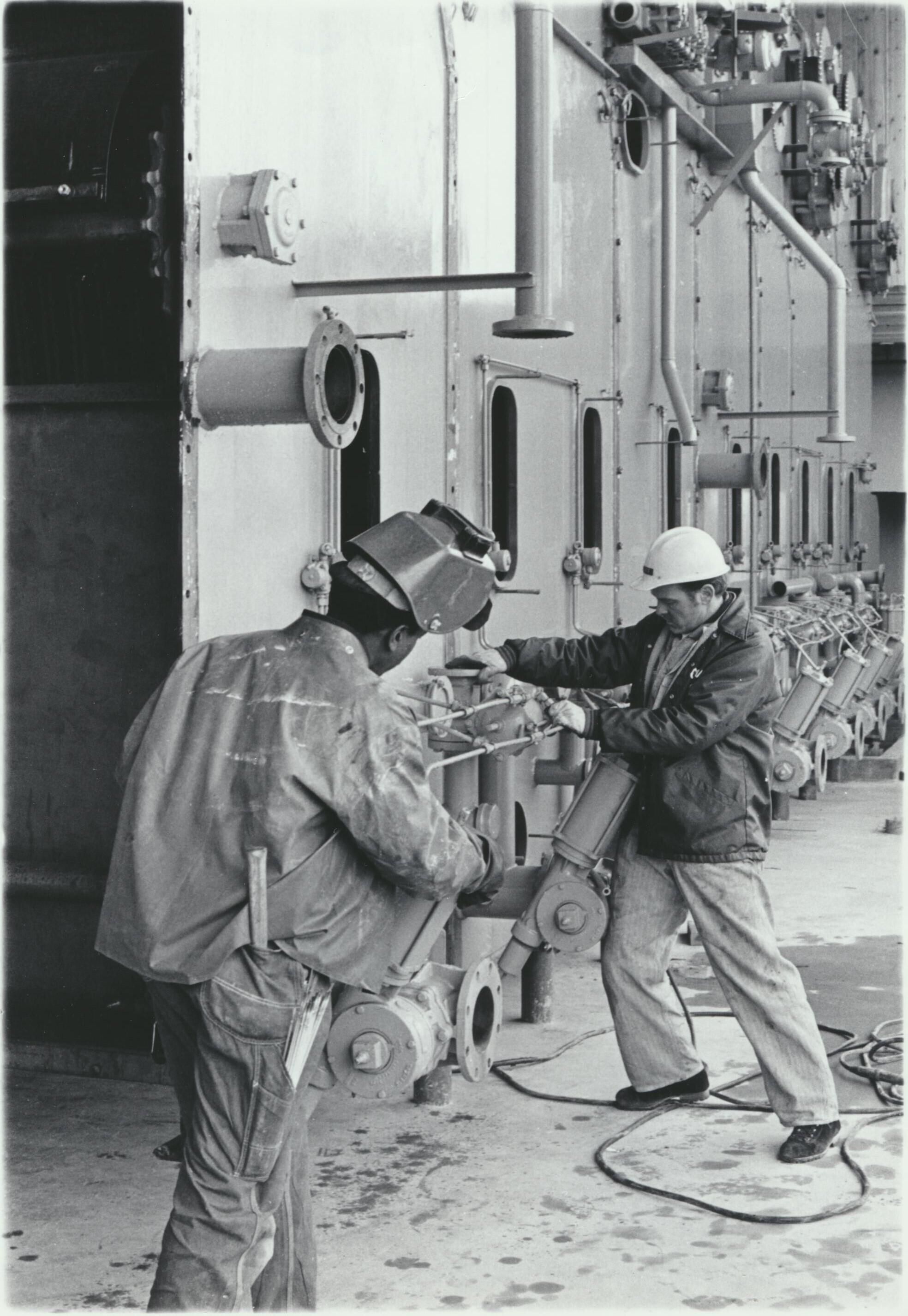 Photograph. Installing a pasteurizer at Olympia brewery. No ID on men.
