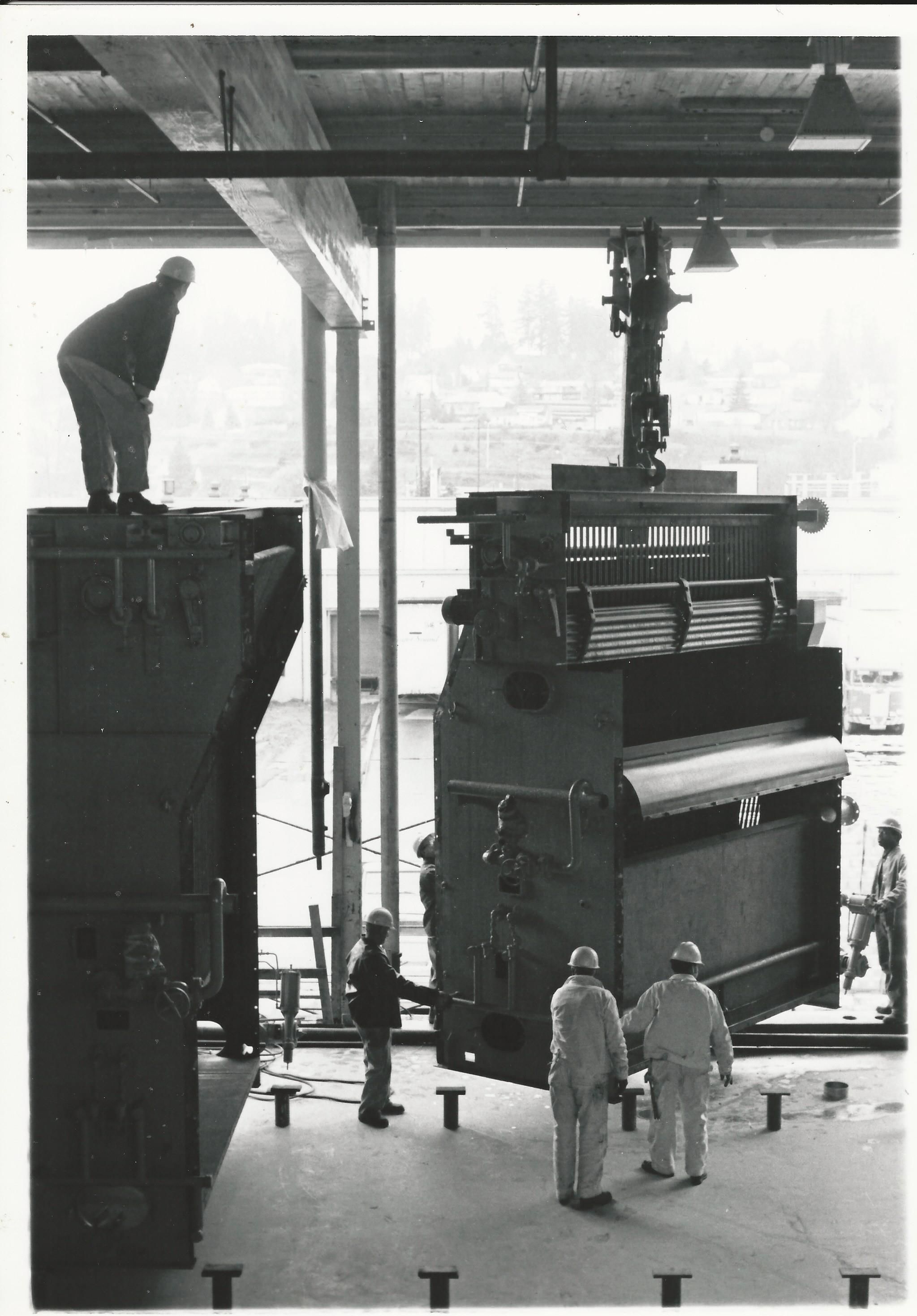 Photograph. Installing equipment at Olympia brewery. No ID on men.