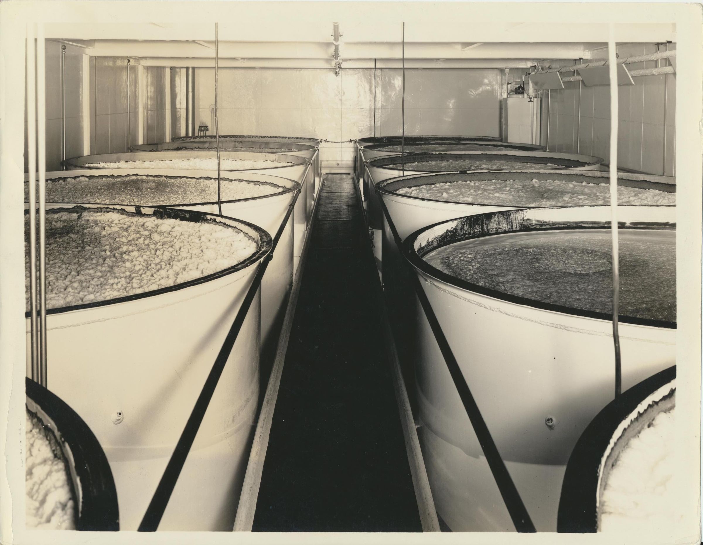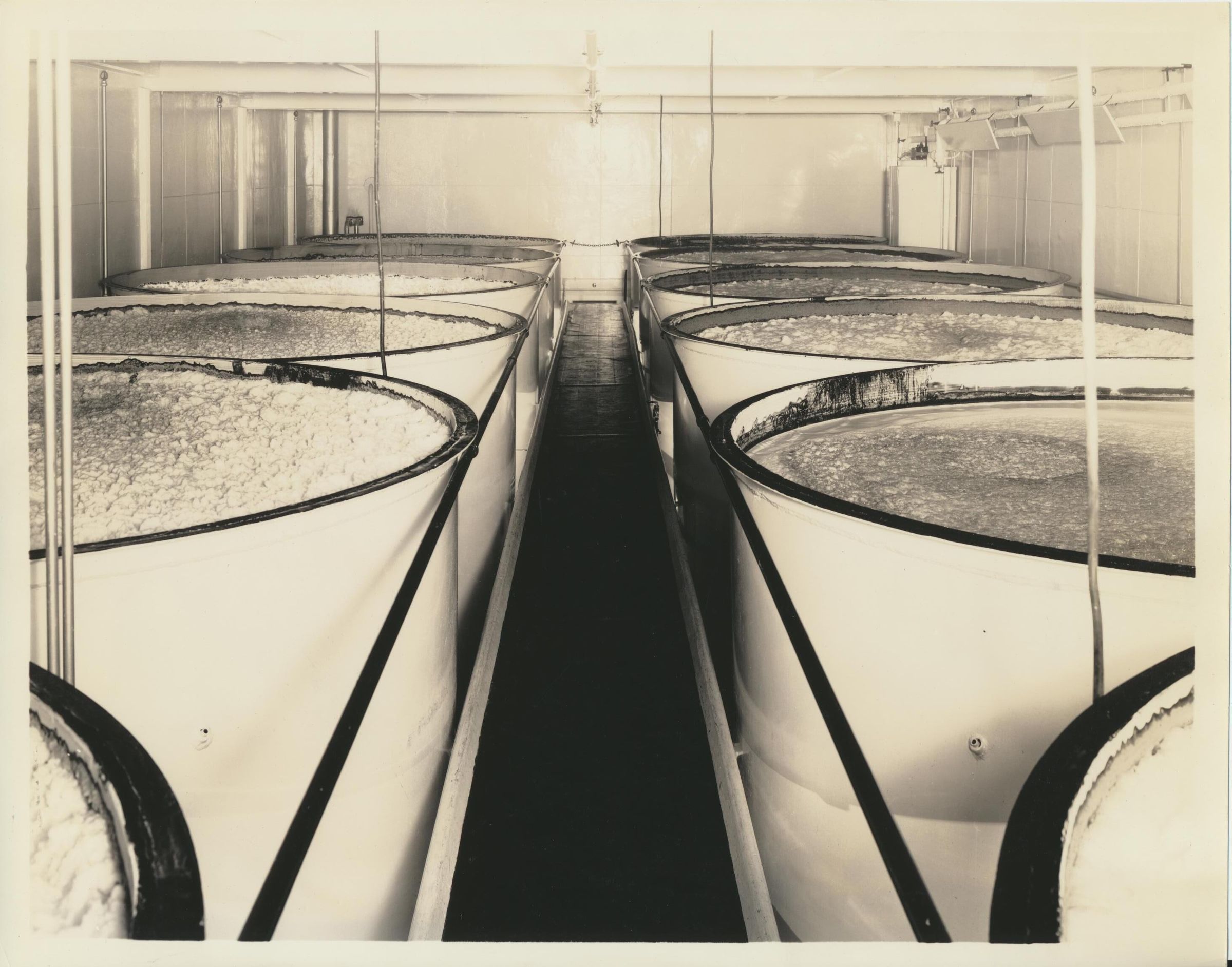 Photograph. Open-top fermenting tanks at Olympia brewery.