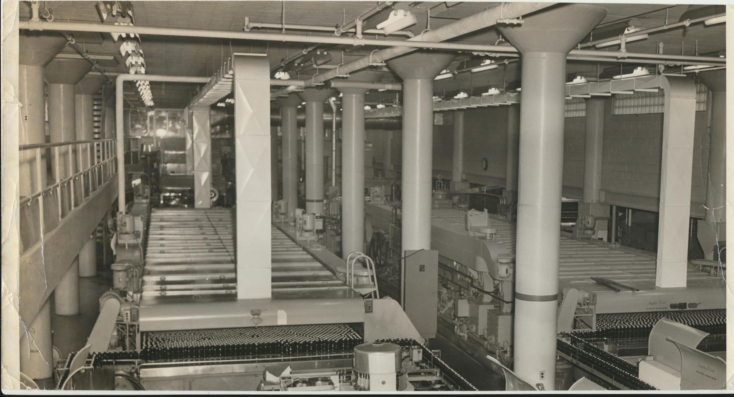 Photograph. Bottles coming out of pasteurizer at bottling house at Olympia brewery.