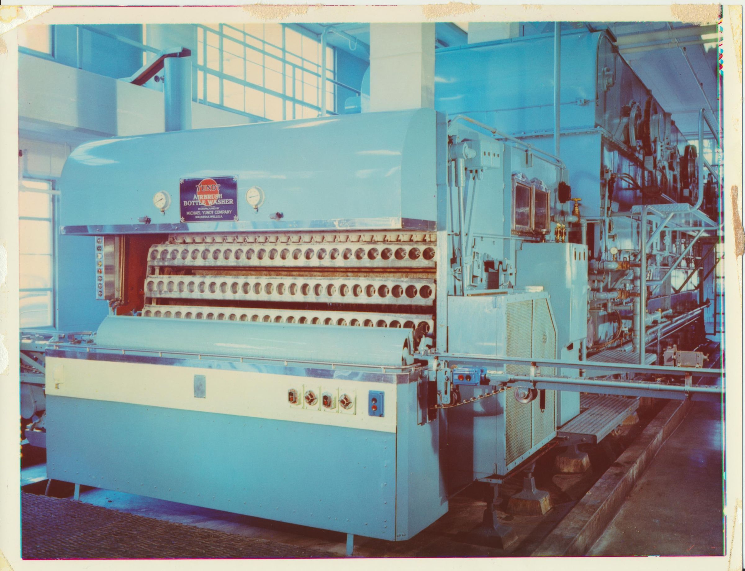 Photograph. Bottle washer at Olympia brewery. Yundt Airbrush Bottle Washer, made by Michael Yundt Co, Waukesha WI. Photo by Color Prints Inc, Hollywood CA.