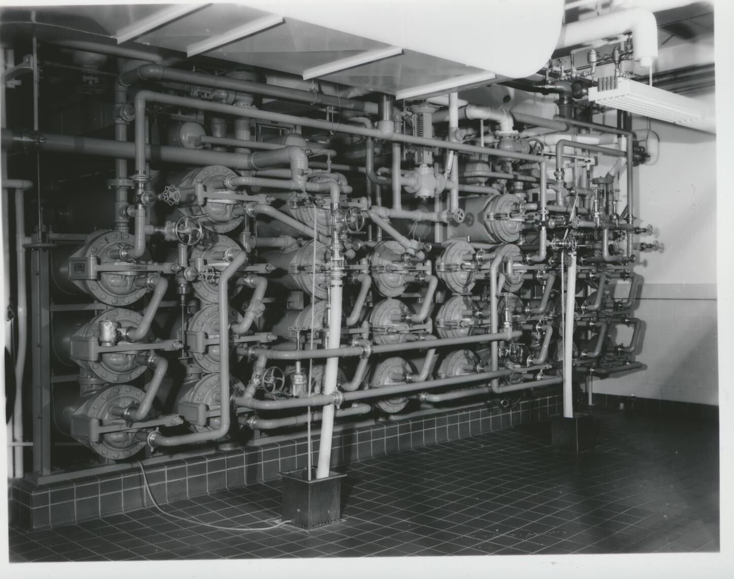 Photograph. Shell and tube wort cooler at Olympia brewery.