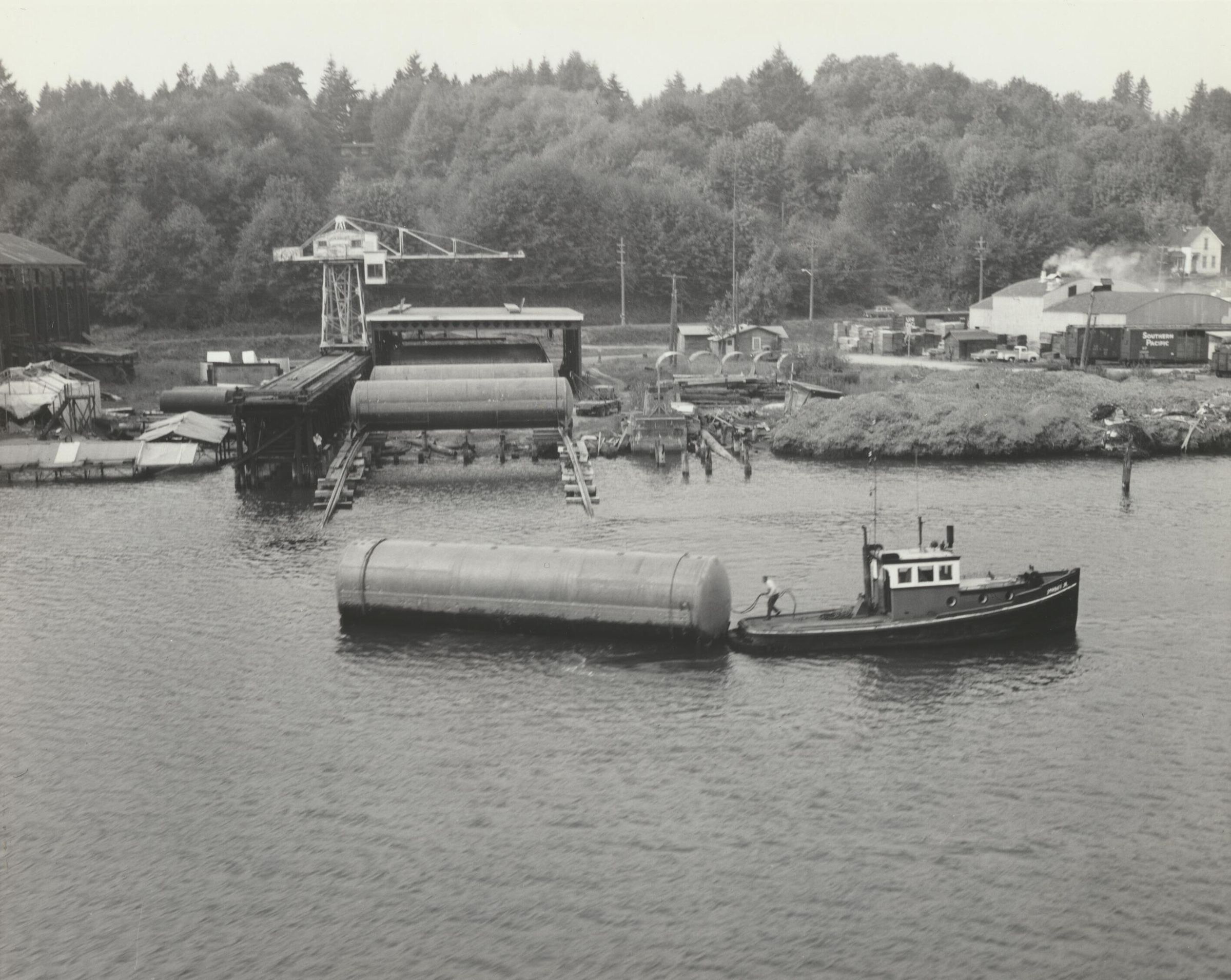 Photograph. Tanks being transported from Reliable Welding, West Bay Drive, Olympia to Olympia brewery. Tanks were rolled into bay, pulled by tug to Percival Dock, then put on railcars for delivery to brewery. Probably for R or S cellar.Name/Title