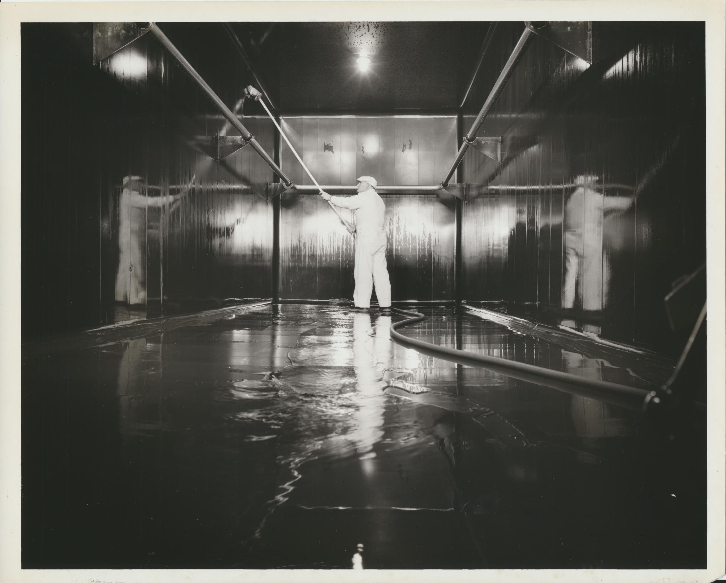 Photograph. Frank Wilson cleaning tank at Olympia brewery.