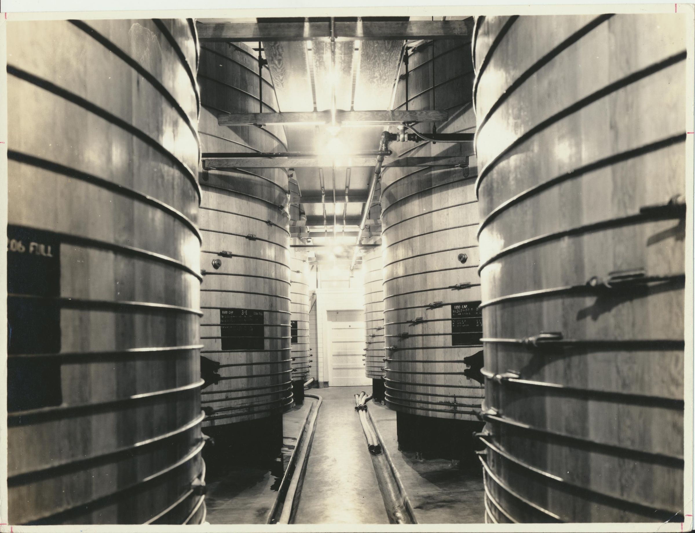 Photograph. Wooden beer tanks (40,000 gallon) in cellar at Olympia brewery.