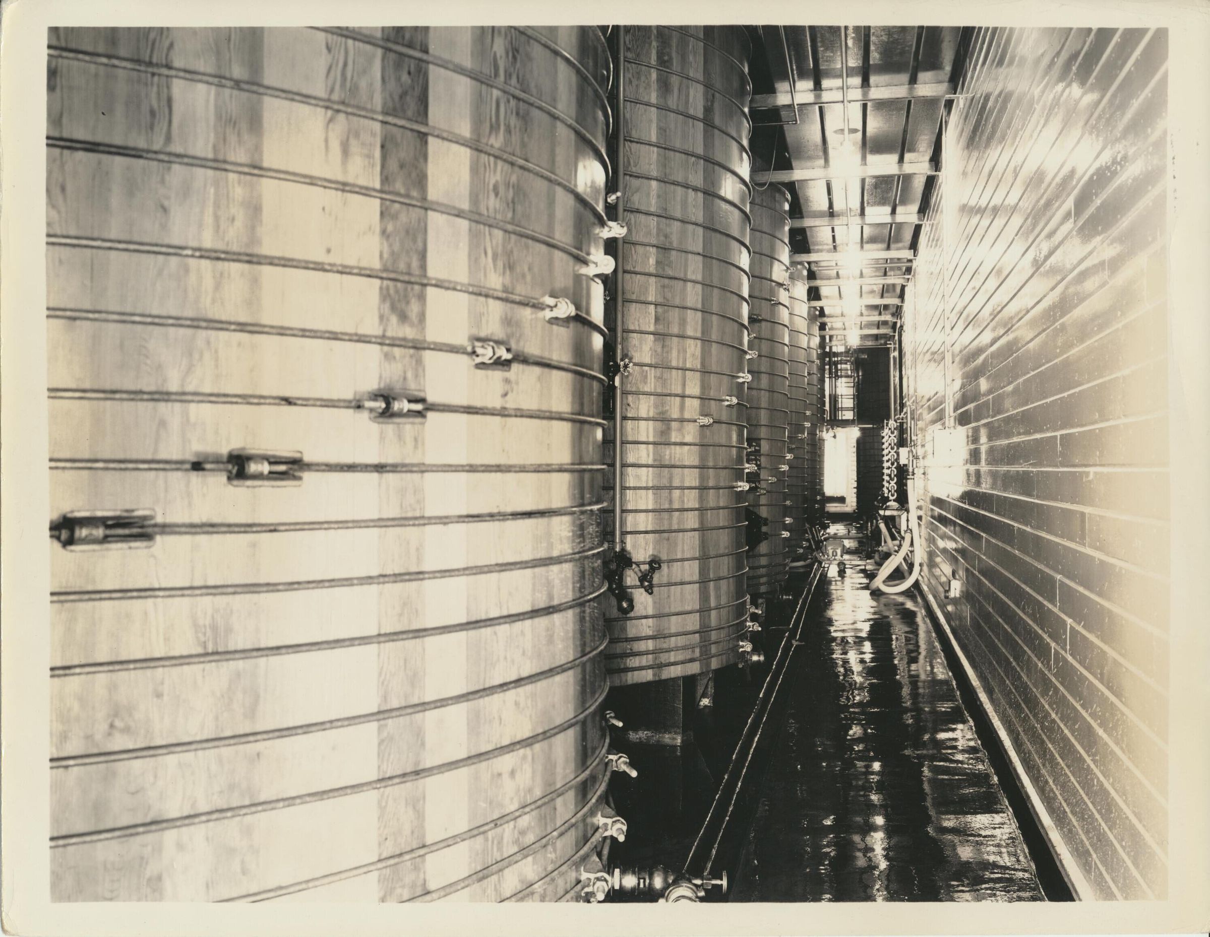 Photograph. Wooden beer tanks (40,000 gallon) in cellar at Olympia brewery.