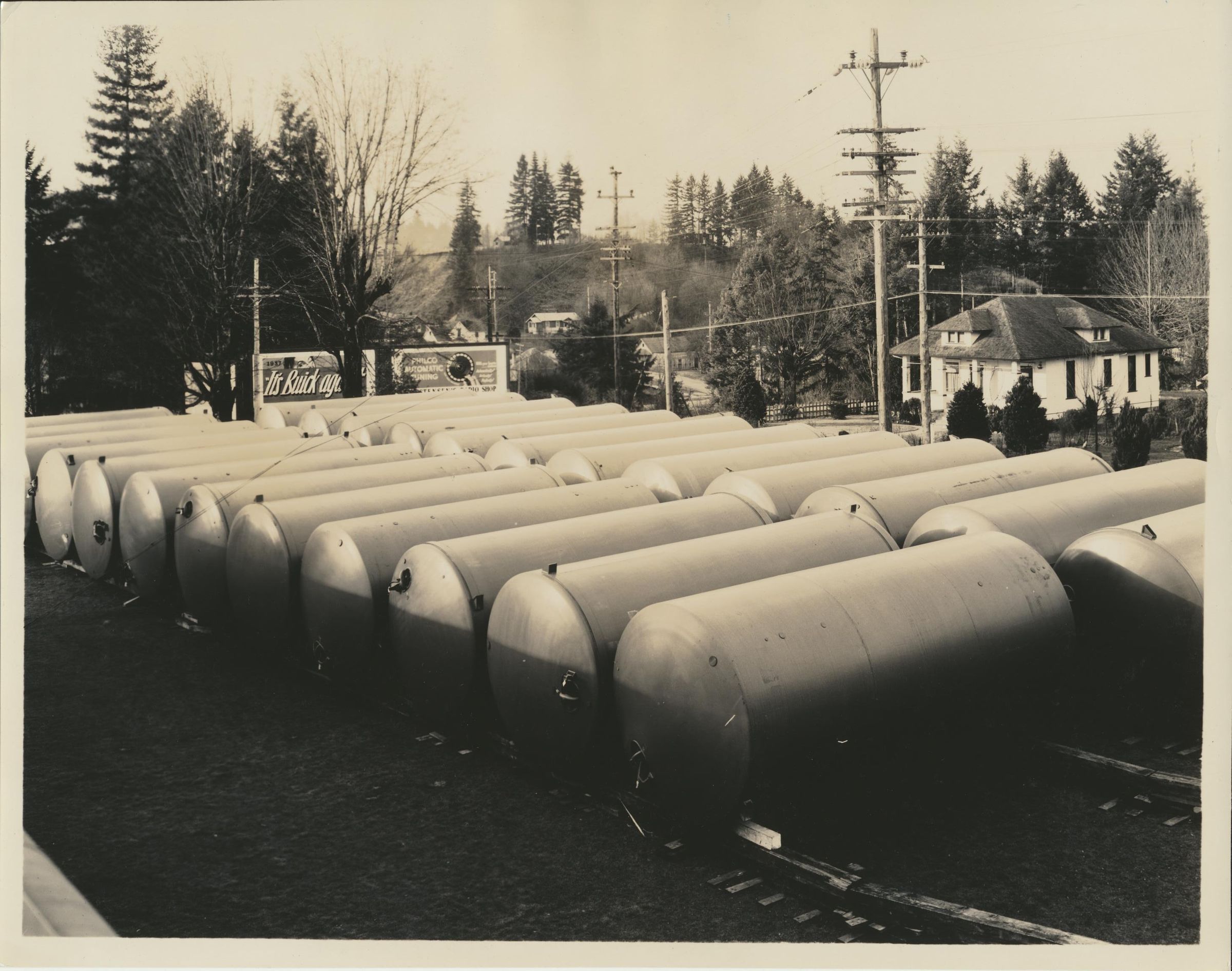 Photograph. Tanks for G, H, and I cellars at Olympia brewery.
