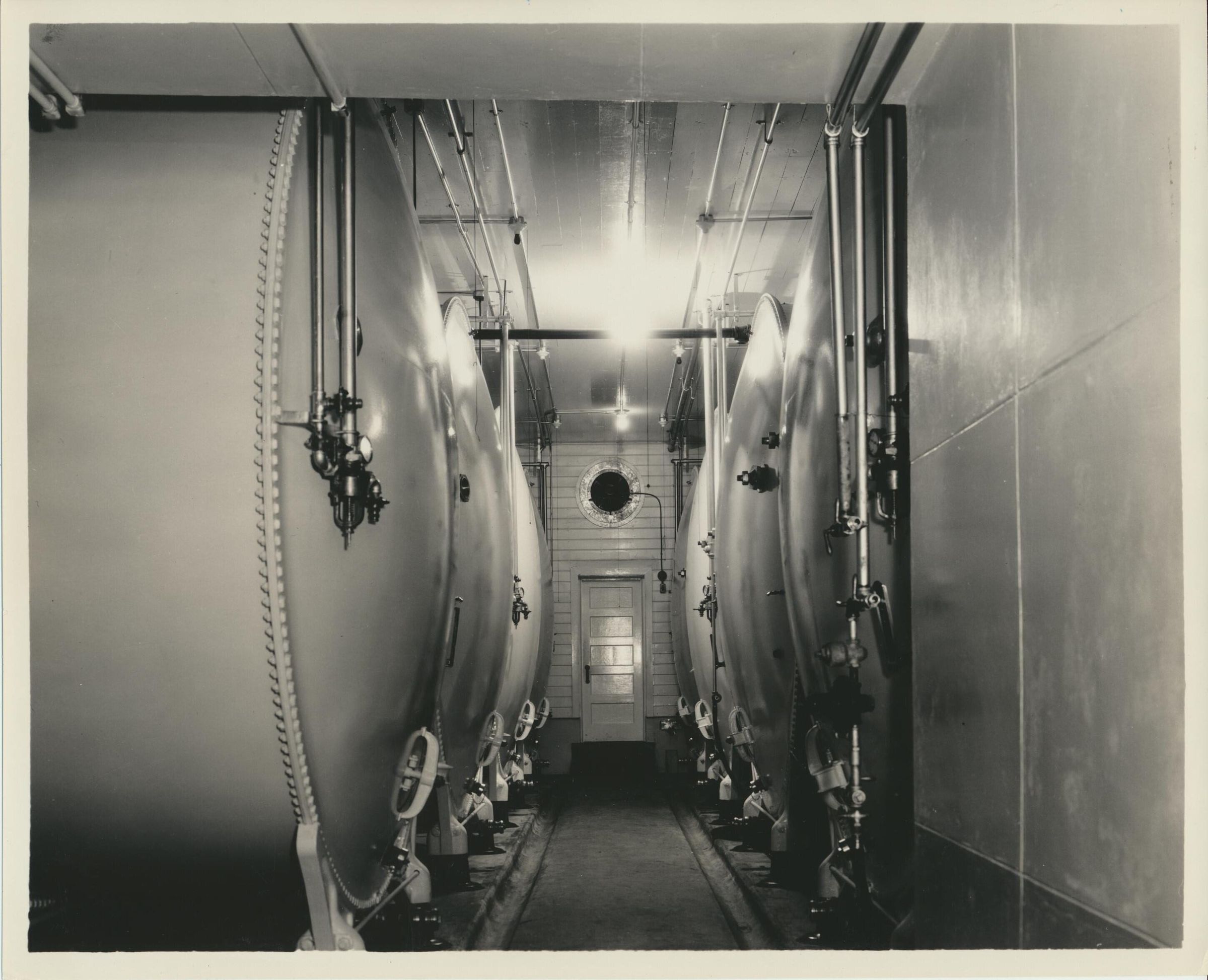 Photograph. Aging tanks in F-cellar at Olympia brewery.