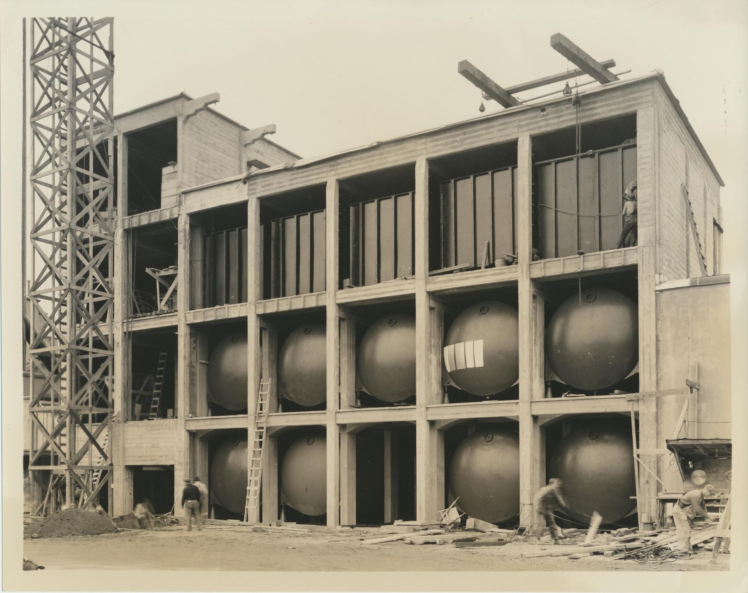 Photograph. Installing tanks in J cellar at Olympia brewery.