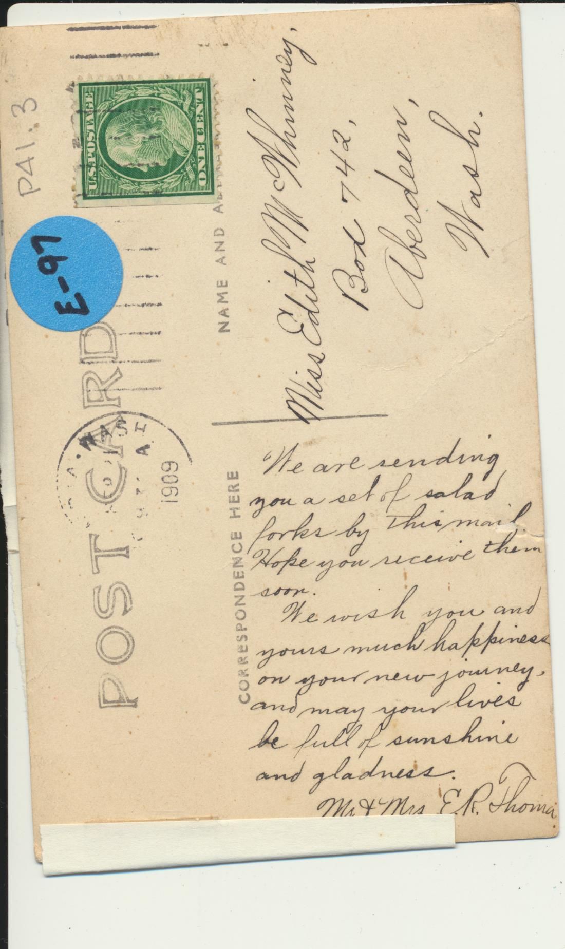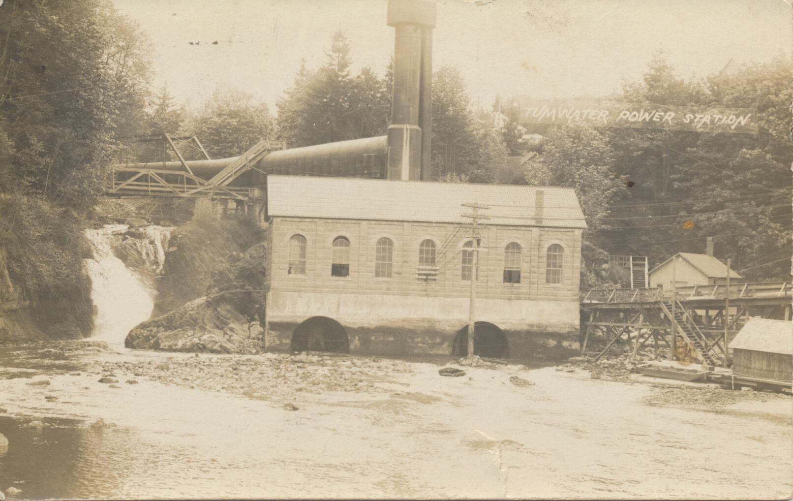 Postcard, picture. Power house #2 at lower falls of Deschutes River. Built in 1904. Large pipe is penstock carrying water from upriver to turbines. Postcard was sent from Olympia to Aberdeen WA. Card was donated to OTF by Mrs. Howard Bray.Other Names and Numbers