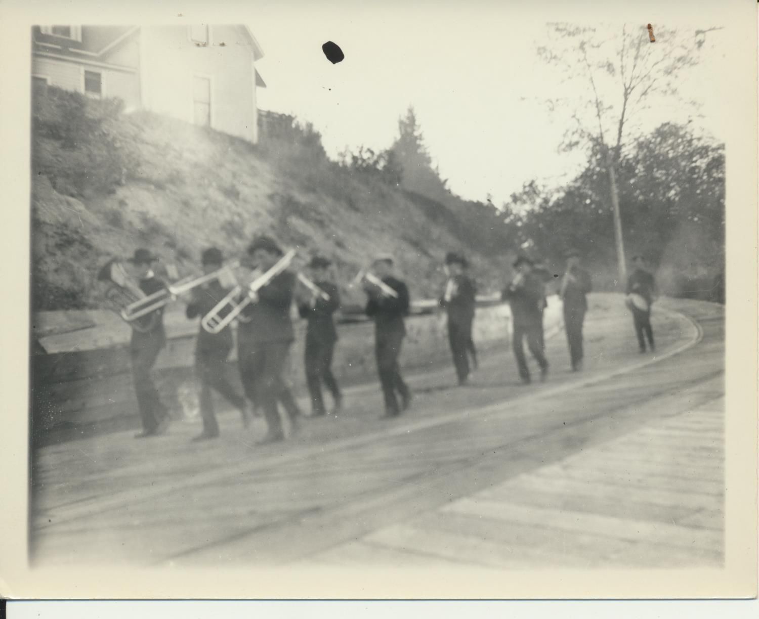 Photograph. Band of musicians marching down access road to Olympia brewery. Hillside Inn in background. Looking south.